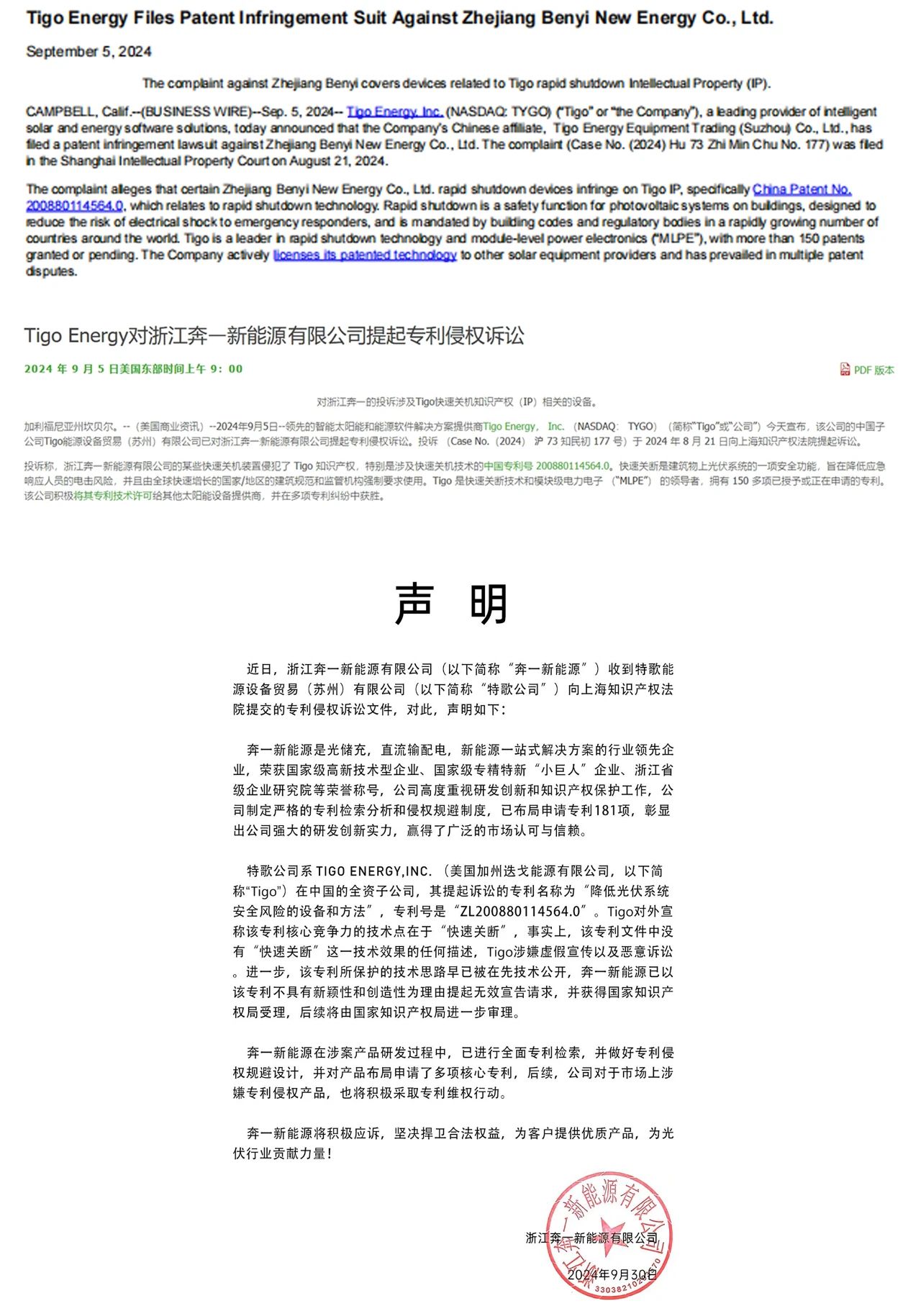 在全球能源转型的浪潮中,技术创新和知识产权保护是推动行业发展的核心动力。奔一公司与Tigo的专利较量,不仅是一场技术与法律的博弈,更是一场关乎行业未来的较量。浙江奔一此次专利战战略突围,标志着中国新能源企业在全球市场中迈出了坚实的一步,为未来中国新能源企业与欧美企业的专利竞争树立了榜样。