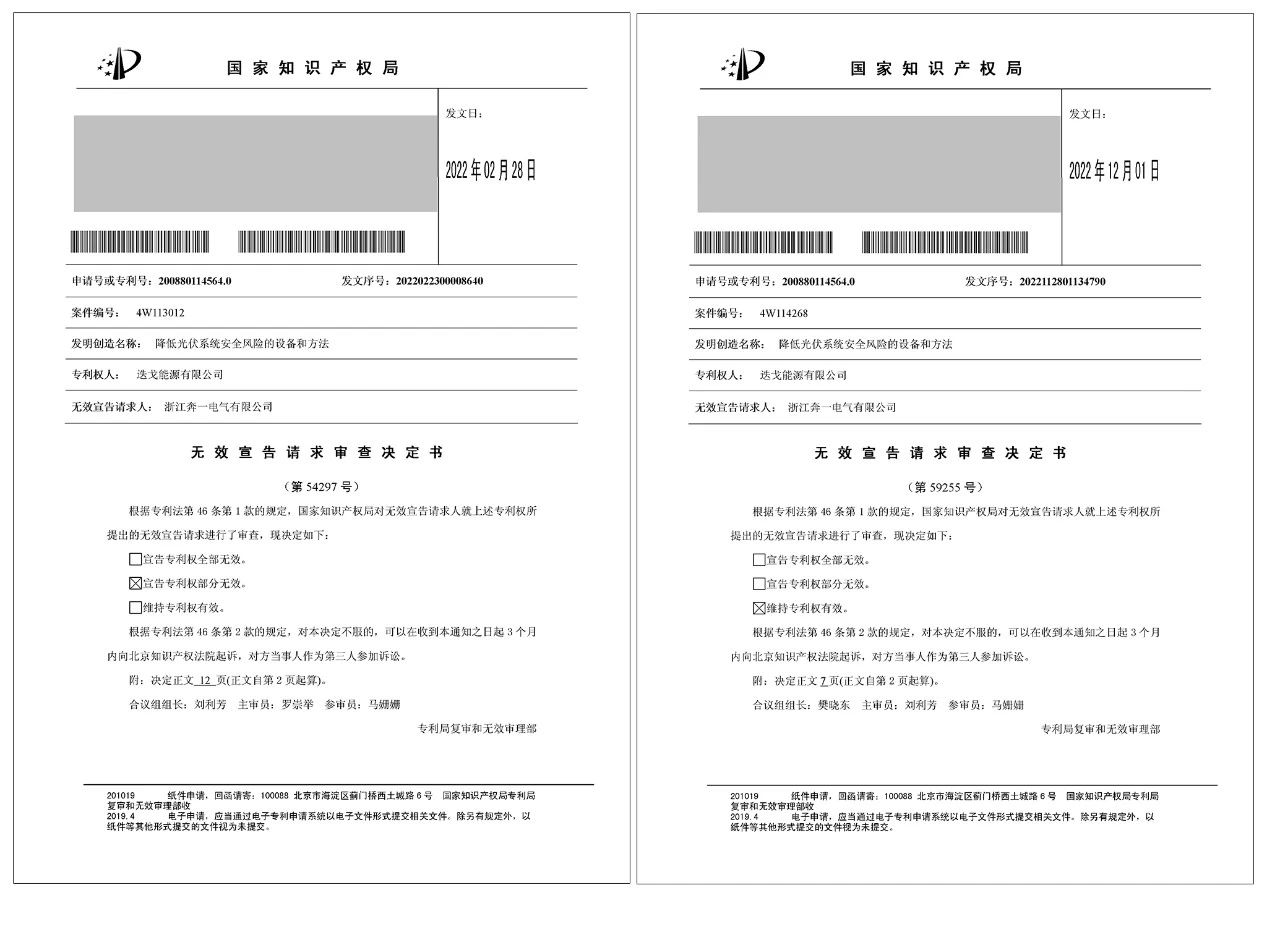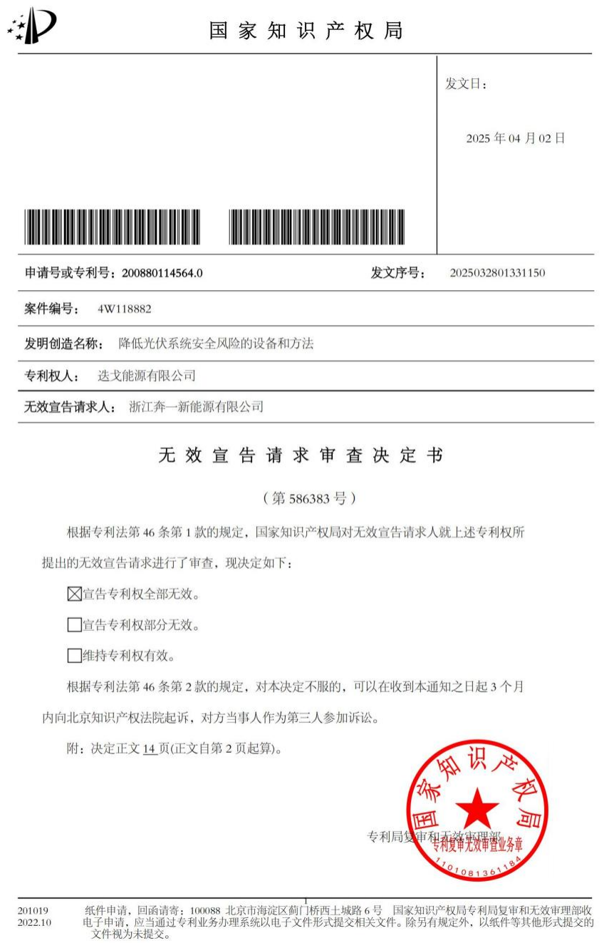 Tigo在专利保护方面的强硬态度引发了行业的广泛关注。然而,Tigo的专利封锁并非坚不可摧。近日一则消息震惊了整个行业——中国新能源企业浙江奔一新能源有限公司在与Tigo的专利无效请求中取得重大胜利,这一事件标志着中国企业在对决全球巨头专利战场上的一次重要突破。同时也暴露了Tigo专利体系的弱点,尤其是在面对技术实力雄厚的中国企业时。
