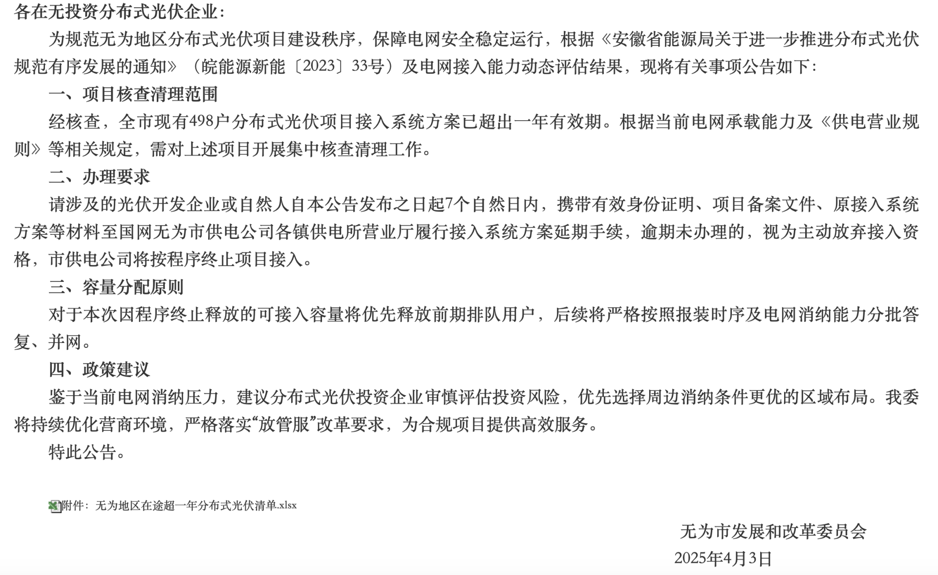 近日,安徽省无为市发改委发布关于集中核查清理无为地区在途超一年光伏项目的公告,涉及498个户用光伏项目。