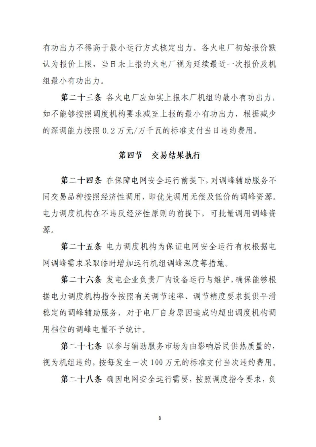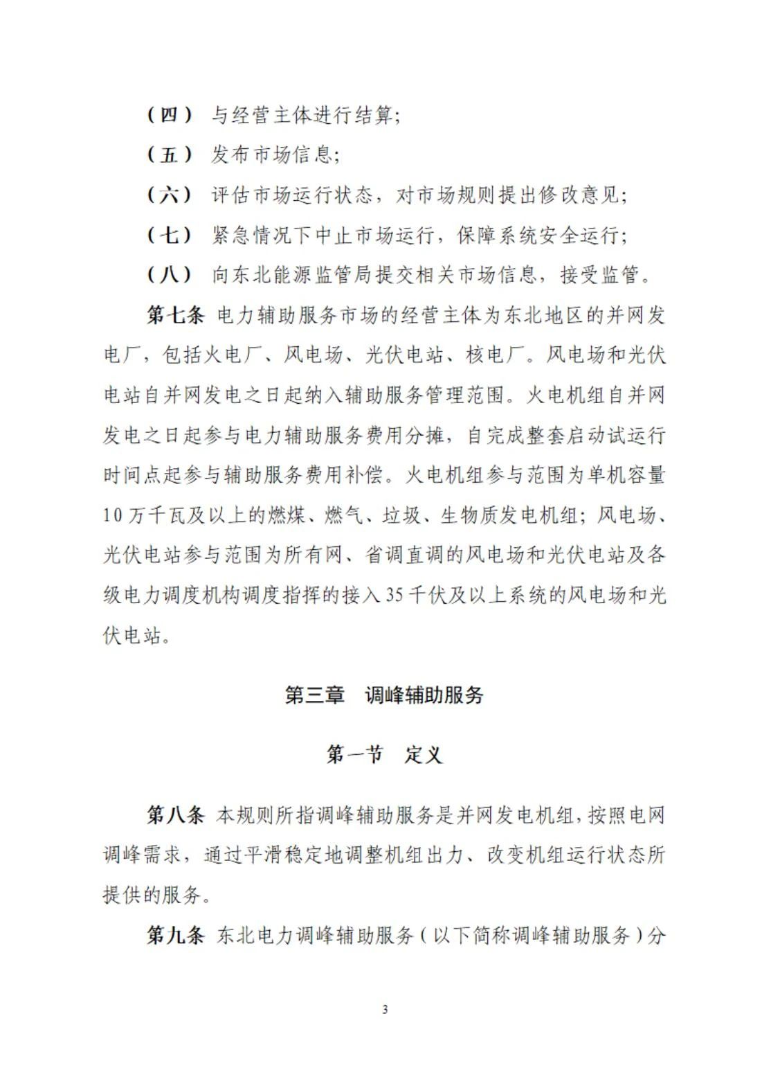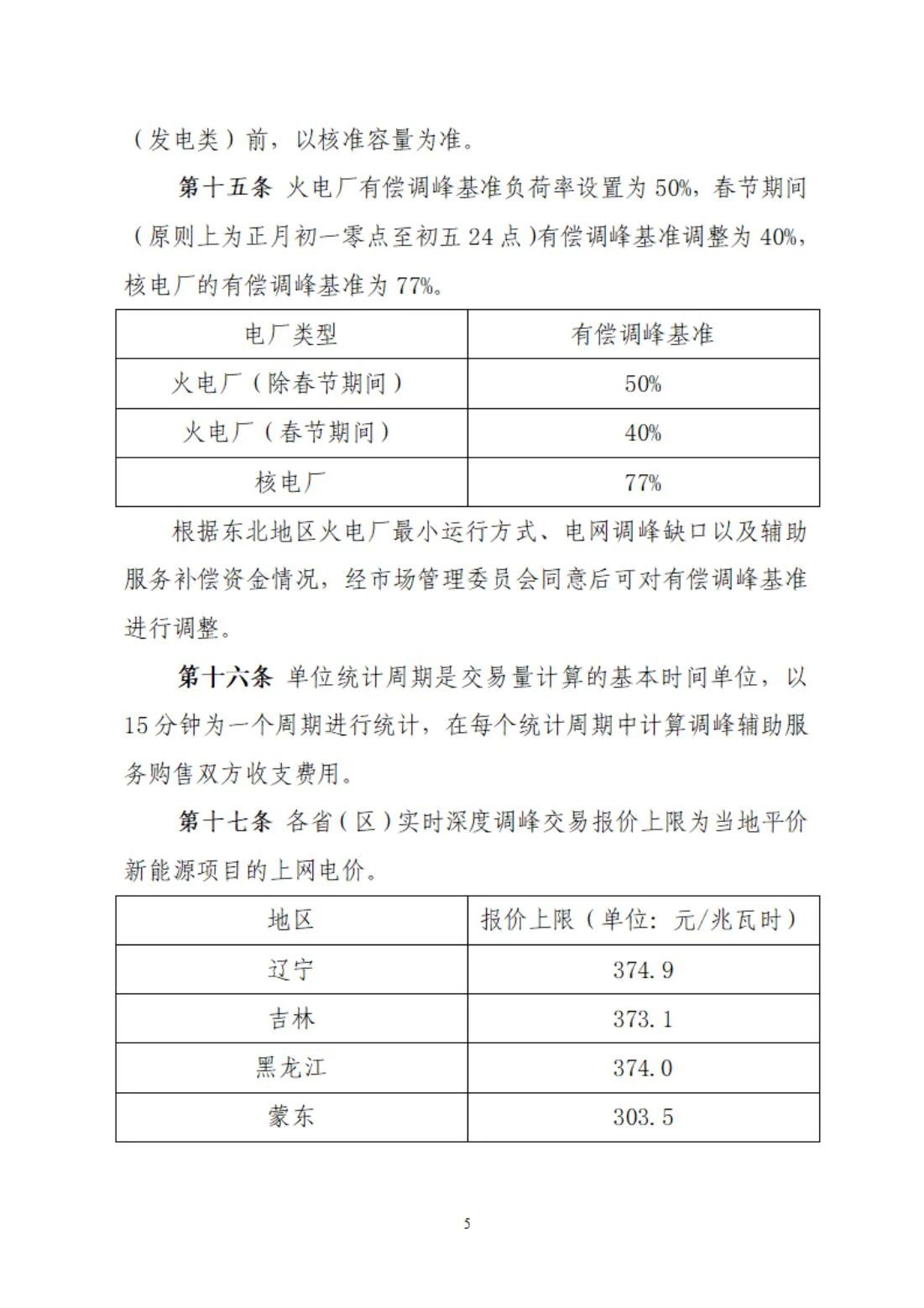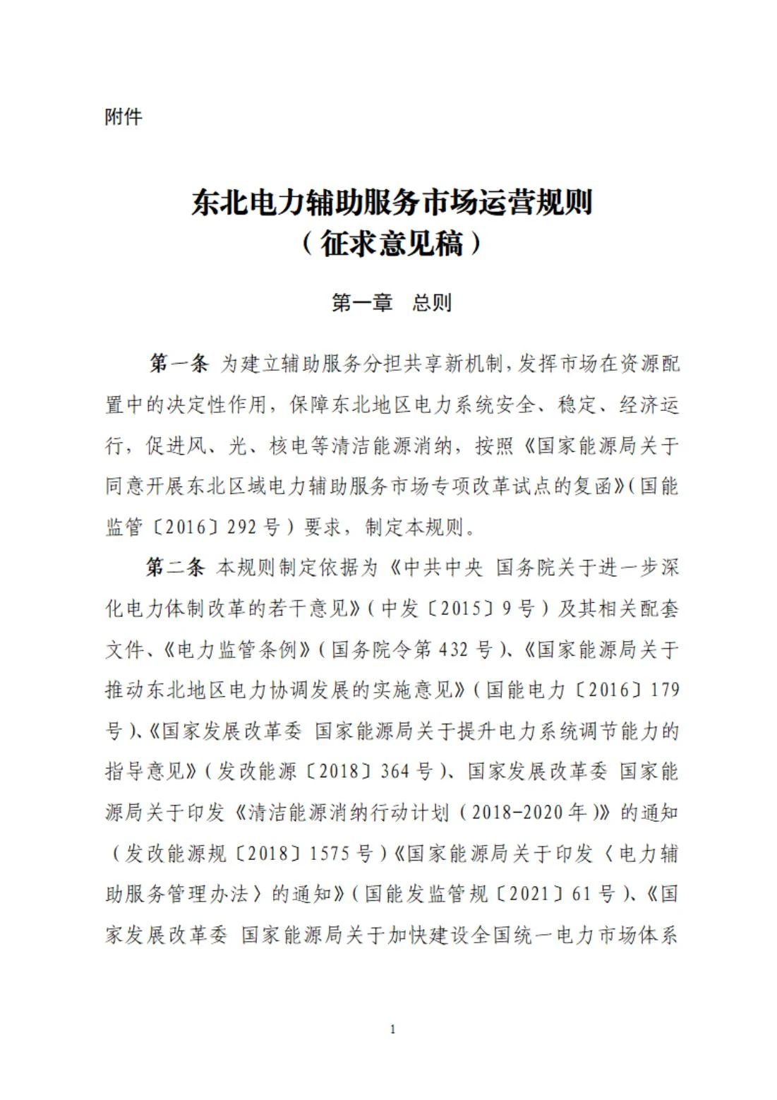 近日,国家能源局东北能源监管局发布《东北电力辅助服务市场运营规则(征求意见稿)》。文件规定,电力辅助服务市场的经营主体为东北地区的并网发电厂,包括火电厂、风电场、光伏电站、核电厂。风电场和光伏电站自并网发电之日起纳入辅助服务管理范围。火电机组自并网发电之日起参与电力辅助服务费用分摊,自完成整套启动试运行时间点起参与辅助服务费用补偿。火电机组参与范围为单机容量10万千瓦及以上的燃煤、燃气、垃圾、生物质发电机组;风电场光伏电站参与范围为所有网、省调直调的风电场和光伏电站及各级电力调度机构调度指挥的接入35 千伏及以上系统的风电场和光伏电站。文件明确规定了调峰辅助服务的相关细则,并表示各省(区)实时深度调峰交易报价上限为当地平价新能源项目的上网电价。