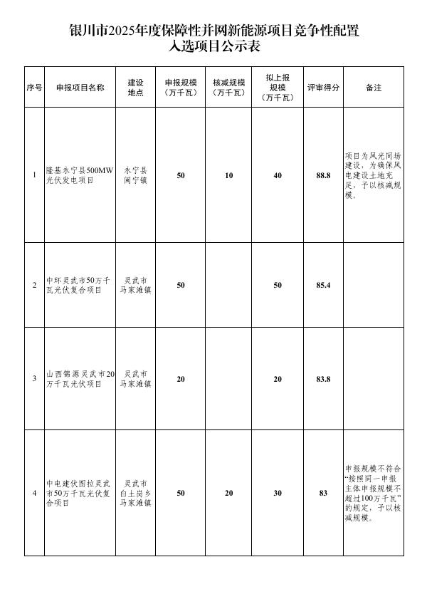 附件:银川市2025年度保障性并网新能源项目竞争性配置入选项目公示表