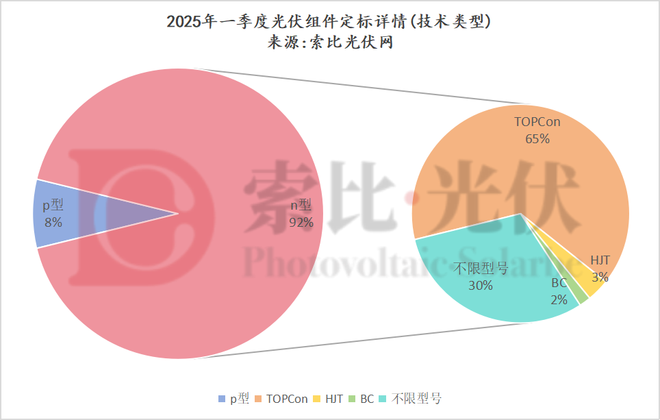 n型占比92%以上,其中TOPCon占比65%、HJT占比3%、BC占比2%,另有30%光伏组件招标并未限定具体的技术要求。