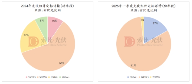 同时,通过梳理公开信息,一季度600W+组件定标占比超80%,较2024年比例提升20%左右,高功率组件成为市场主流趋势,预计2025年光伏组件主流功率将进一步提升。