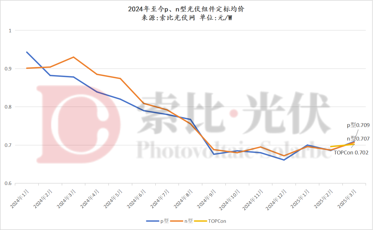 其中,n型组件3月份中标单价在0.692~0.784元/W,均价0.707元/W,较上月涨幅3%左右,较2024年底涨幅超5%;p型组件3月份中标均价0.709元/W,较上月涨幅约3.4%,较2024年底涨幅超7%。