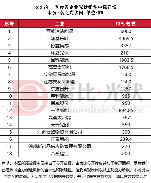 据索比咨询价格追踪数据显示,上周硅料价格不变,但受国内“430”抢装政策及海外订单推动,硅片需求激增,价格上涨。3月31日,TCL中环宣布上调硅片报价,183mm硅片单价从1.23元涨至1.3元,210R与210mm规格分别上调0.05元至1.55元和1.6元,涨幅约5.7%-6.5%。有消息称,在"430政策节点"催生的抢装潮背景下,3月中旬光伏供应链核心企业召开会议,小幅上调硅片至组件环节上半年配额基准线,但目前已经出现个别企业超比例生产的情况。市场端反馈,组件环节呈现“库存清空、一天一价”现状,部分高电价保障地区甚至出现近0.9元/W的高报价。在此背景下,主流组件厂商普遍上调排产规划,预计4月组件排产仍维持高位运行,现货市场交易小幅溢价。通过梳理近期中标详情,索比光伏网发现,2025年一季度有超70GW光伏组件定标。其中: