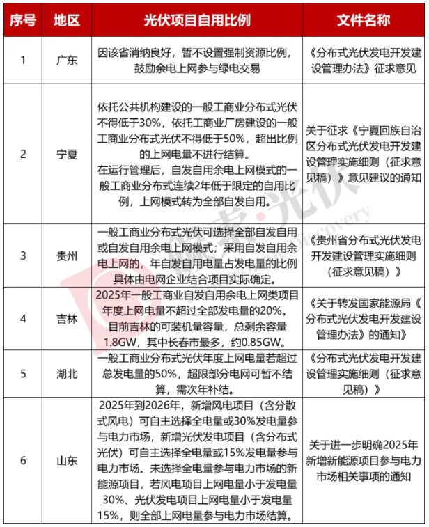 目前,广东、贵州、宁夏、吉林、湖北、山东六省明确各省工商业光伏自发自用比例,其中: