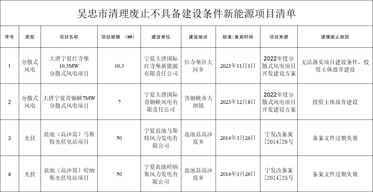 文件显示,吴忠市清理废止不具备建设条件新能源项目共4个,规模共计117.3MW,包含大唐集团旗下2个风电项目17.3MW,宁夏马斯特实业集团旗下两个光伏项目100MW。项目清理废止原因为无法落实项目建设条件、投资主体放弃建设或备案文件过期失效。