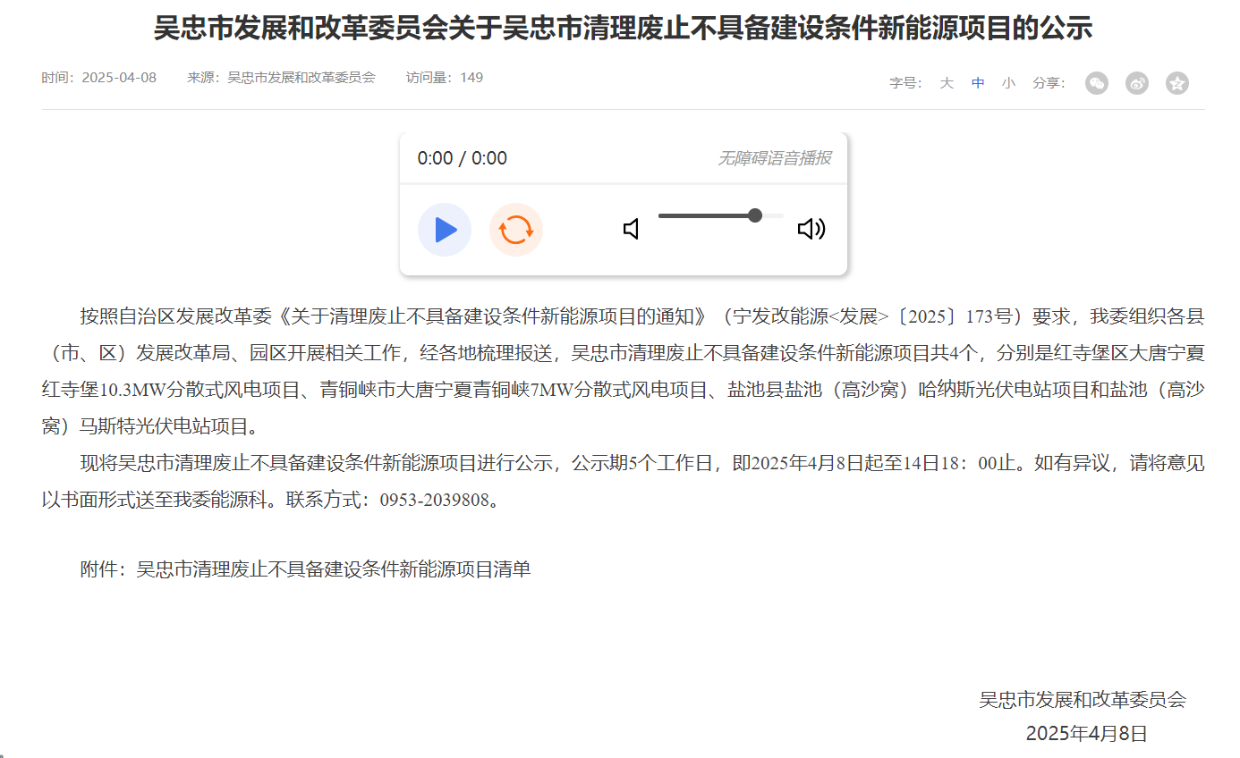 4月8日,吴忠市发展和改革委员会发布关于吴忠市清理废止不具备建设条件新能源项目的公示。