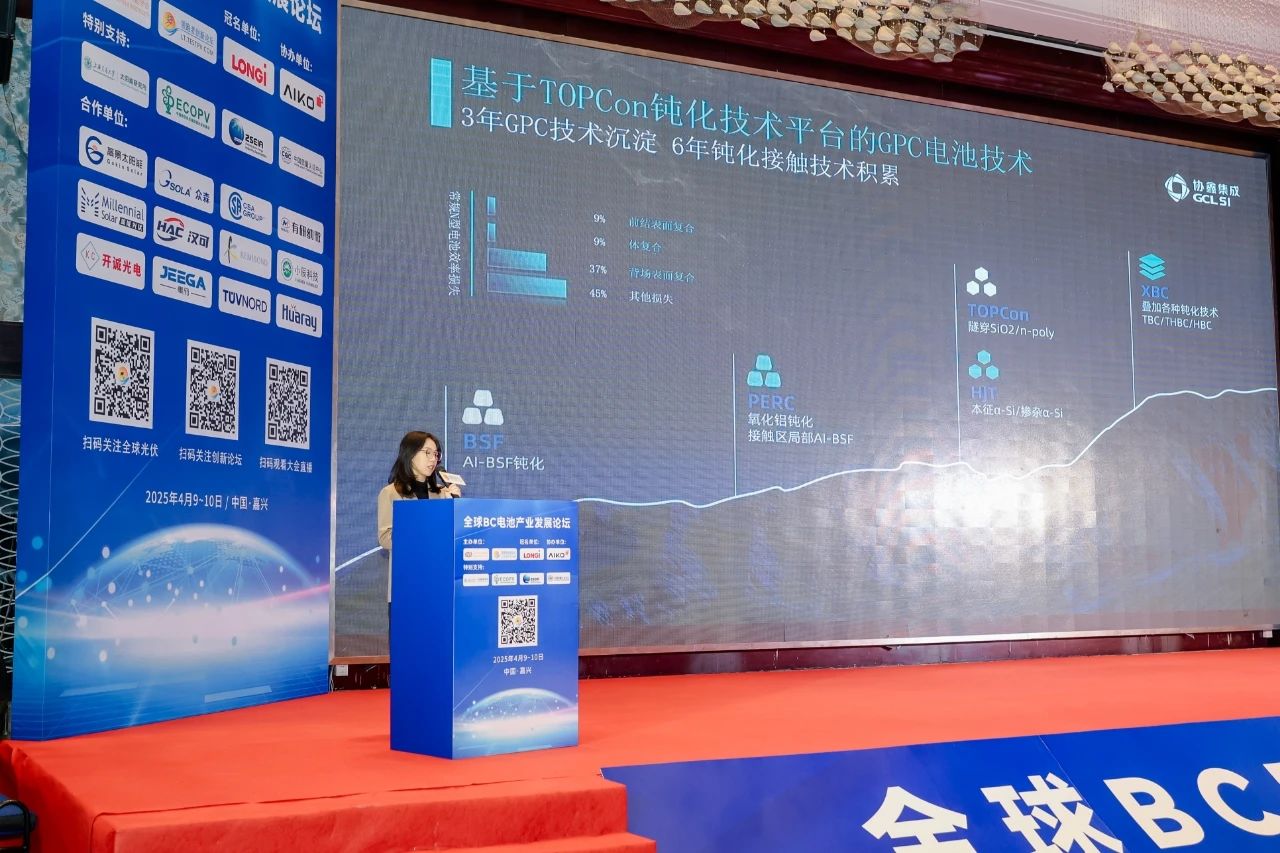 同期论坛中,协鑫集成产品总监盛夏在论坛现场分享了一场题为《分布式场景的超配密码-解锁GPC2.0背后的技术》的精彩演讲,盛夏表示,随着全球分布式光伏市场规模的持续增长,客户对光伏项目的需求日益多元化,不仅关注系统造价,更希望光伏项目能兼具美观外观、更大装机容量和多功能性。针对这一市场需求,协鑫集成不断创新,凭借对“高收益、强适配、稳定运行”核心需求的深刻理解,通过容量、收益与可靠性的三维超配协同创新,实现了新的技术飞跃。在此基础上,协鑫集成推出了基于BC技术的GPC2.0高效组件。