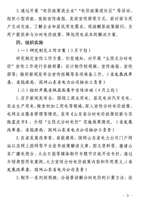 召开新闻发布会,围绕工商业用电、居民电动汽车充电、农业生产用电、粮食初加工用电等领域,深入宣传分时电价政策电网企业服务管理等情况,发布《山东省分时电价政策创新与实践蓝皮书》,介绍“五段式分时电价”实施效果情况。