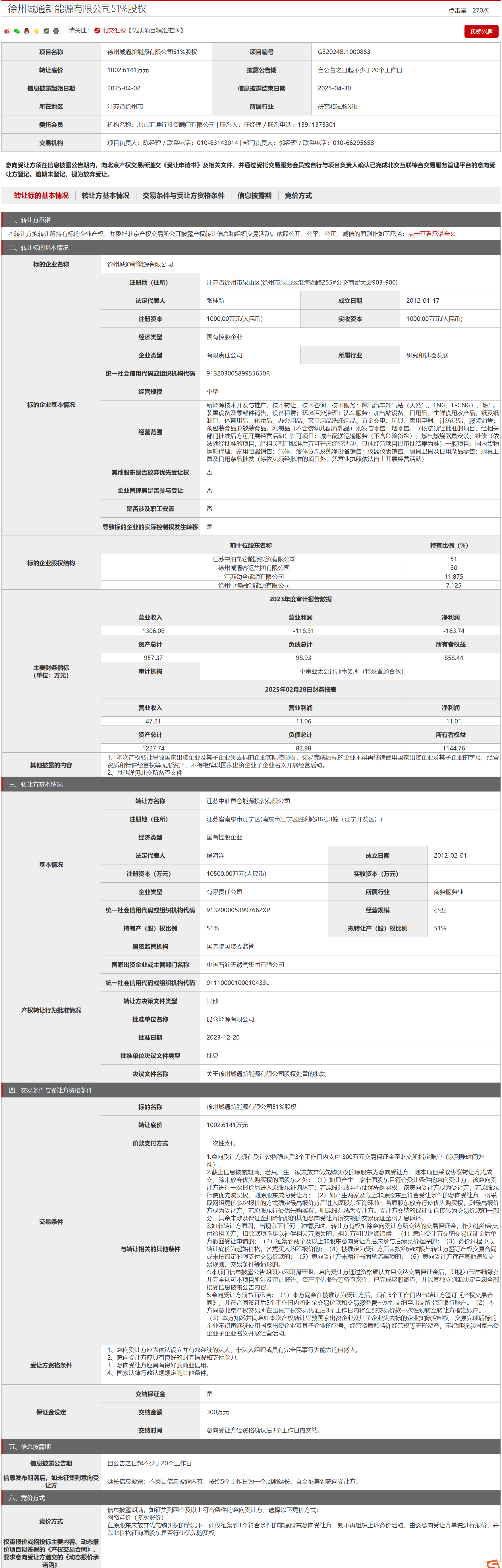 4月2日,北京产权交易所网站显示,江苏中油昆仑能源投资有限公司转让徐州城通新能源有限公司51%股权。