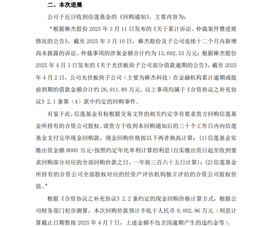 信莲基金表示,以上事项均属于《合资协议之补充协议》中约定的回购事件。鉴于此,有权根据交易文件的相关约定享有要求棒杰股份回购其所持有的江山棒杰股权。且根据约定的现金回购价格计算方式,据棒杰股份财务部门初步测算,本次回购价款预计不低于9002.96万元。