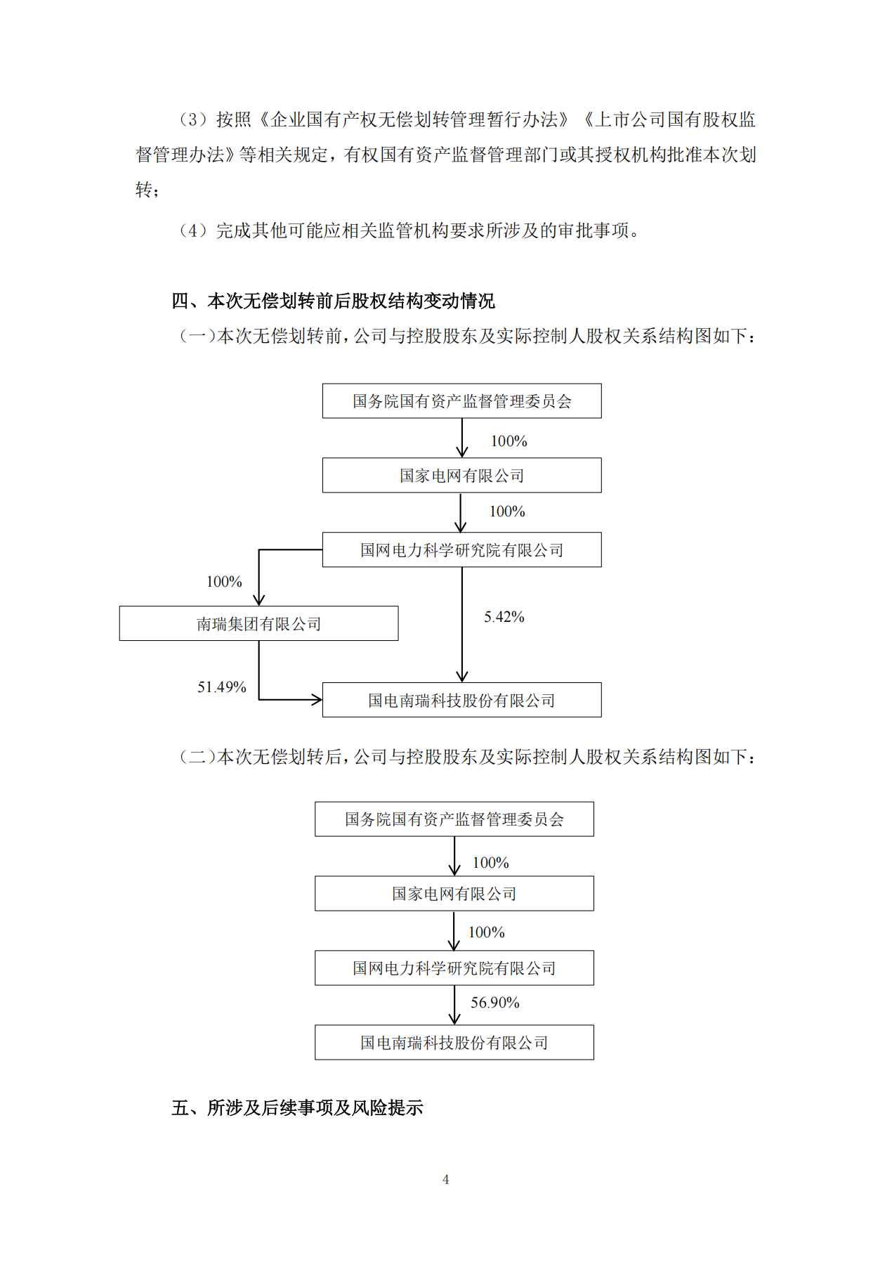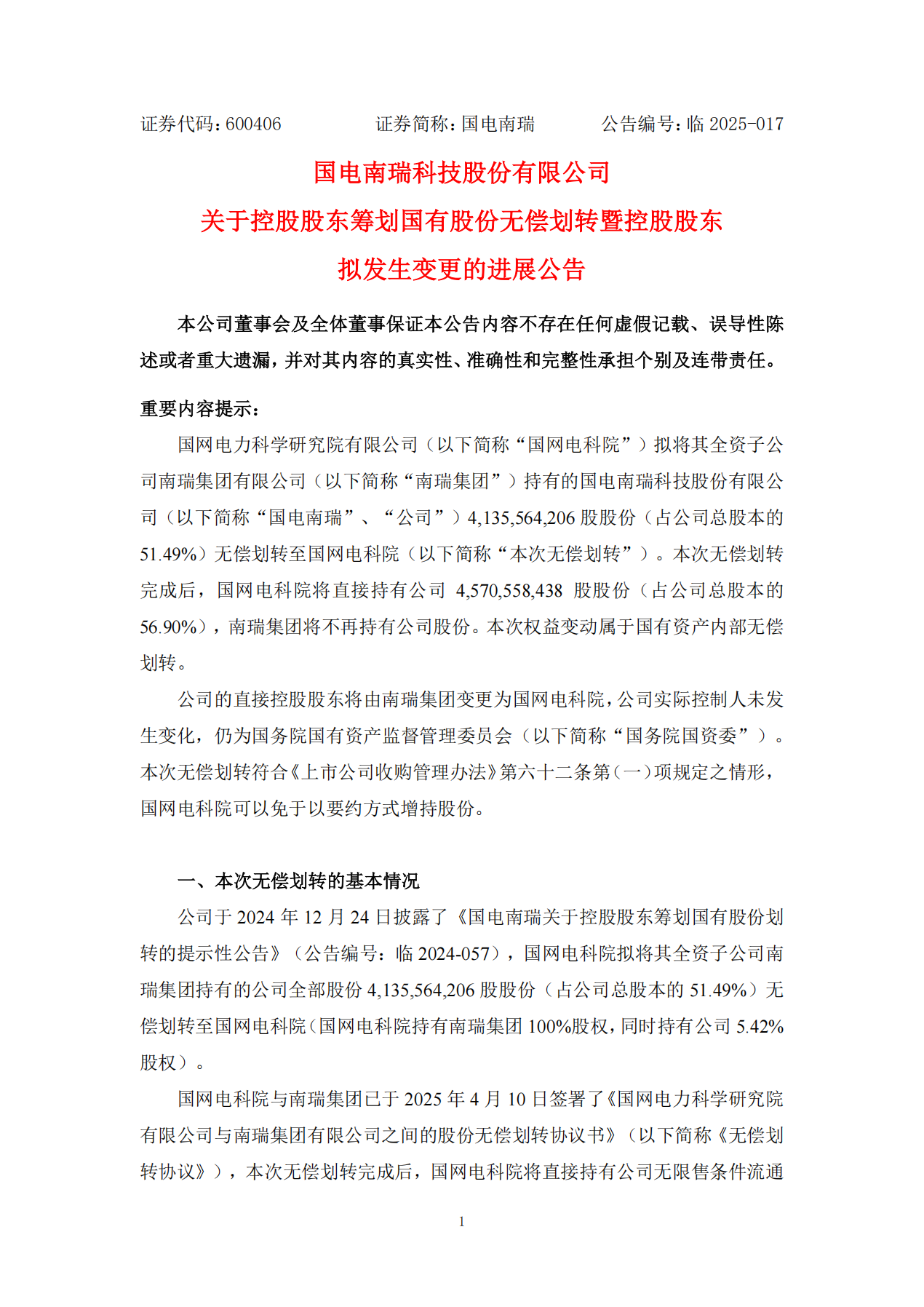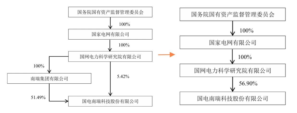 根据国电南瑞发布的《关于控股股东筹划国有股份无偿划转暨控股股东拟发生变更的进展公告》,其控股股东南瑞集团有限公司(简称“南瑞集团”)拟将其持有的国电南瑞51.49%股份(约41.36亿股)无偿划转至母公司国网电力科学研究院有限公司(简称“国网电科院”)。划转完成后,国网电科院将直接持有国电南瑞56.90%股份,成为其直接控股股东,而南瑞集团将不再持有国电南瑞股份。