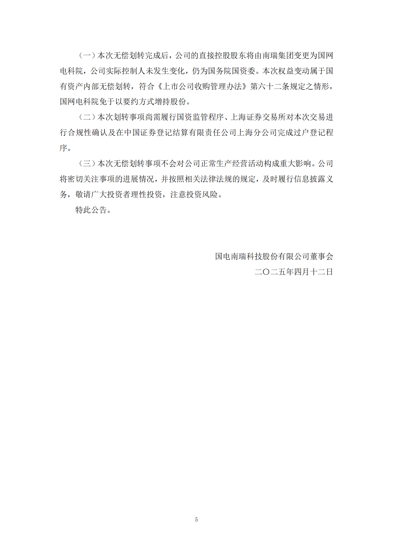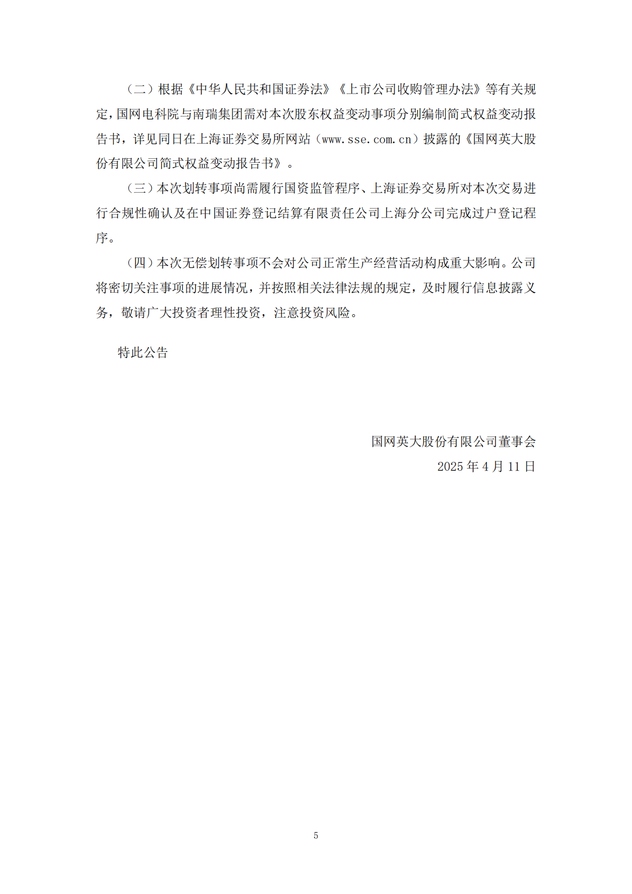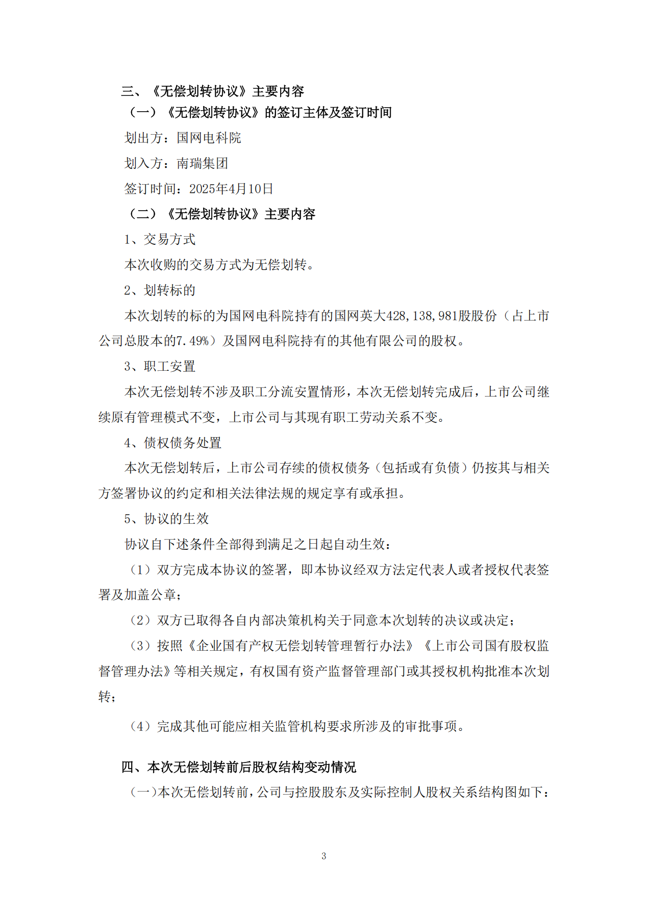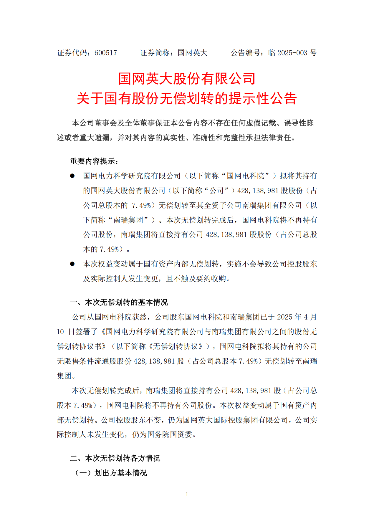 同日,国网英大发布《关于国有股份无偿划转的提示性公告》,披露国网电科院拟将其持有的国网英大7.49%股份(约4.28亿股)无偿划转至全资子公司南瑞集团。划转完成后,国网电科院将不再直接持有国网英大股份,南瑞集团则成为其第四大股东。
