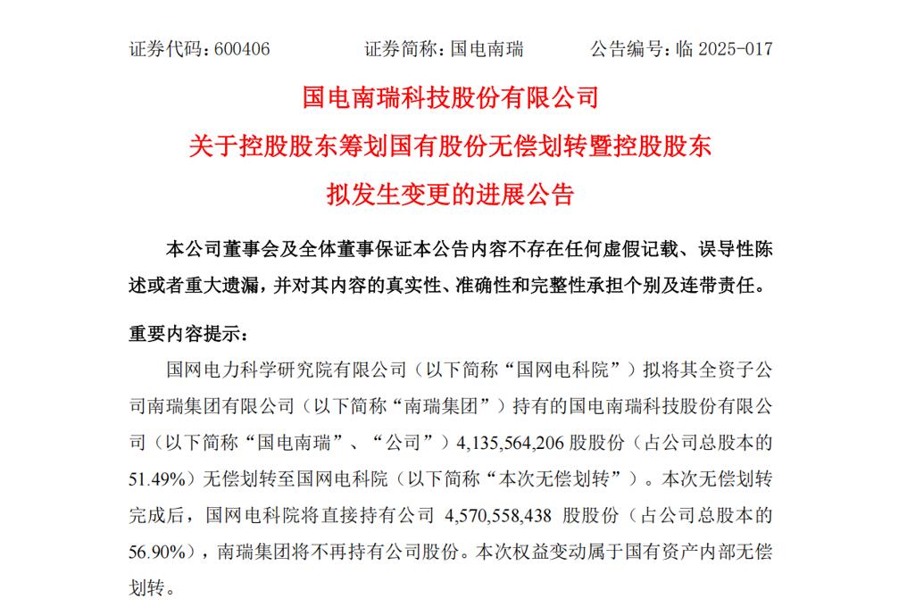 近日,国家电网旗下两家上市公司国电南瑞科技股份有限公司(简称“国电南瑞”)与国网英大股份有限公司(简称“国网英大”)同步发布公告,披露国有股份无偿划转进展。