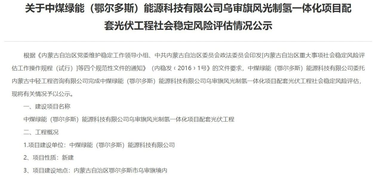 近日,内蒙古乌审旗人民政府发布关于中煤绿能(鄂尔多斯)能源科技有限公司乌审旗风光制氢一体化项目配套光伏工程社会稳定风险评估情况公示。