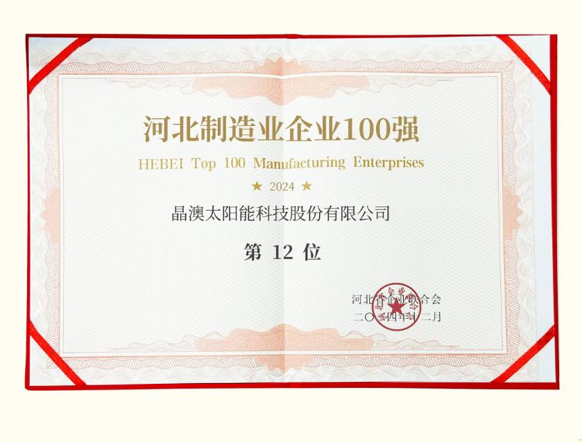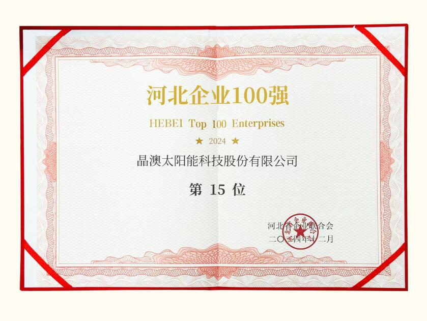 近日,由河北省企业联合会主办,以“新质生产力引领下的大企业变革”为主题的“新时代河北大企业高质量发展大会”在石家庄召开。会议同时发布了2024河北企业100强、河北制造业企业100强榜单。晶澳科技以卓越的综合实力斩获 “2024 河北企业100强第15名”、“2024 河北制造业企业100强第12名”,连续多年稳居新能源领域头部阵营!
