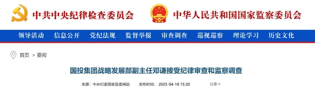 中央纪委国家监委网站4月16日消息,据国家开发投资集团有限公司纪检监察组、甘肃省纪委监委消息:国家开发投资集团有限公司战略发展部副主任邓谦涉嫌严重违纪违法,目前正接受国家开发投资集团有限公司纪检监察组纪律审查和甘肃省庆阳市监察委员会监察调查。
