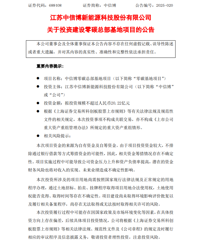 4月17日,中信博发布关于投资建设零碳总部基地项目的公告。