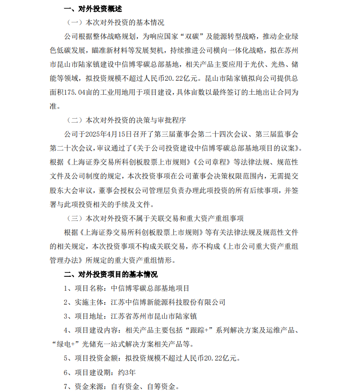 为响应国家“双碳”及能源转型战略,推动企业绿色低碳发展,瞄准新材料等发展契机,持续推进公司横向一体化战略,中信博拟在苏州市昆山市陆家镇建设中信博零碳总部基地,相关产品主要应用于光伏、光热、储能等领域,相关产品主要包括“跟踪+”系列解决方案及运维产品、“绿电+”光储充一站式解决方案相关产品等,拟投资规模不超过人民币20.22亿元,建设期约3年。昆山市陆家镇拟向公司提供总面积175.04亩的工业用地用于项目建设,具体亩数以最终签订的土地出让合同为准。