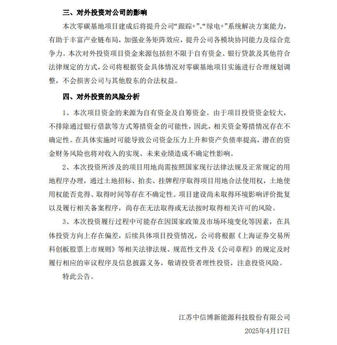 中信博表示,本次零碳基地项目建成后将提升公司“跟踪+”、“绿电+”系统解决方案能力,有助于丰富产业链布局,加强业务矩阵效应,提升公司各模块协同能力及综合竞争力。本次对外投资项目资金来源包括但不限于自有资金、银行贷款及其他符合法律规定的方式,公司将根据资金具体情况对零碳基地项目实施进行合理规划调整,不会损害公司与其他股东的合法权益。