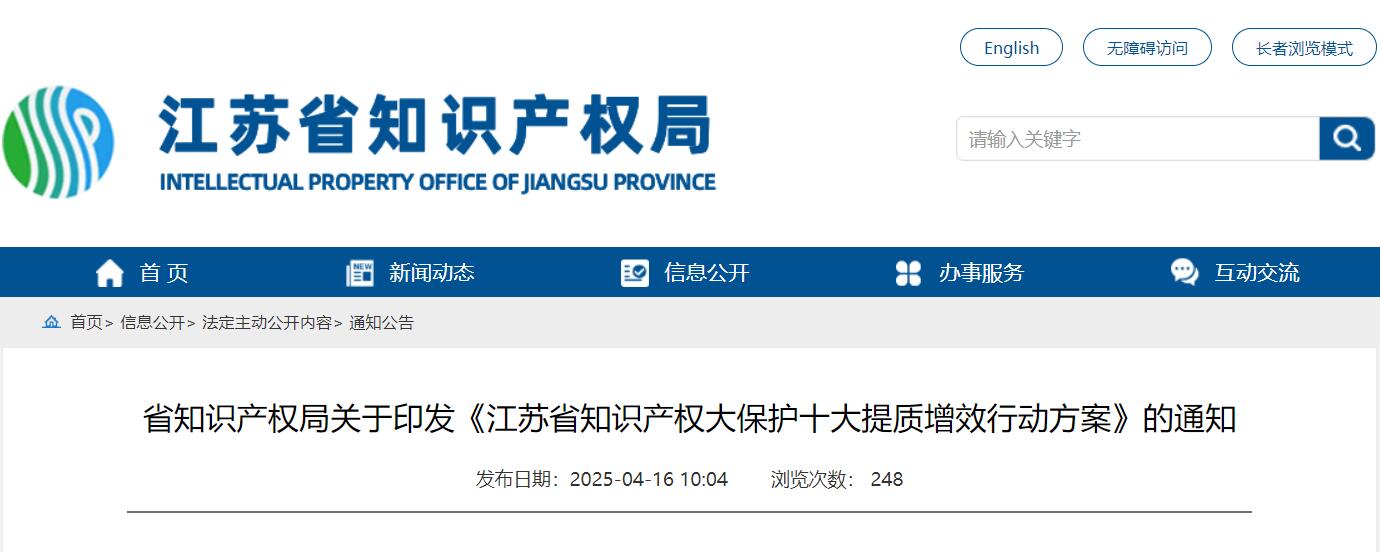 (七)知识产权智慧监管赋能行动。推动知识产权监管数字化转型,丰富江苏省知识产权综合服务平台功能,加强知识产权执法和维权案件统计,持续推进知识产权“一件事”集成改革,积极探索人工智能、云计算、大数据、区块链等新一代信息技术在侵权违法风险监测、线索摸排、侵权判定等知识产权保护场景中的应用,支持面向知识产权保护等垂直细分领域,开发智能体、应用程序、智能生态等形式的大模型产品,赋能知识产权保护。