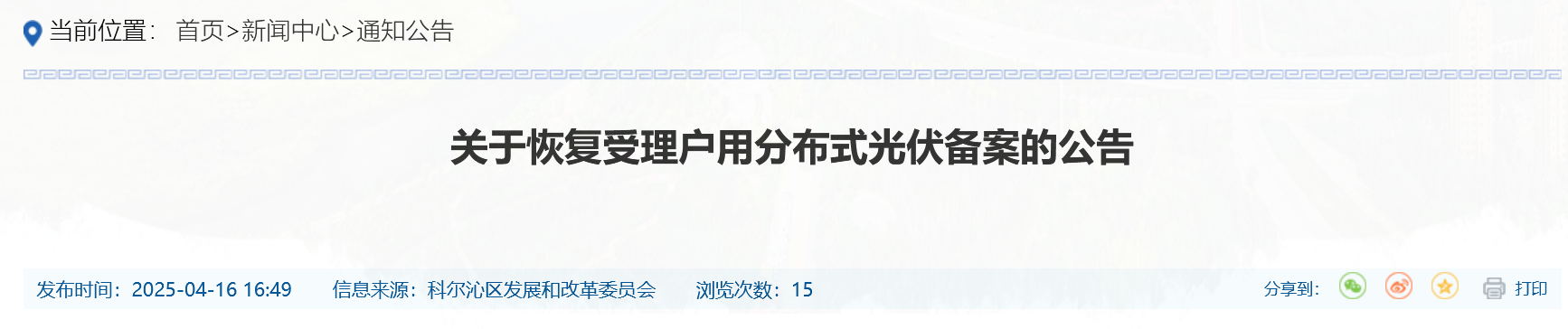 4月16日,内蒙古通辽市科尔沁区发展和改革委员会发布关于恢复受理户用分布式光伏备案的公告。