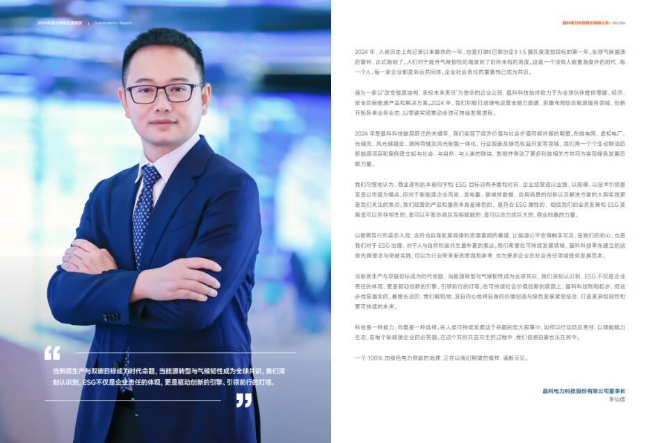 作为公司首份可持续发展报告,该报告参考联合国可持续发展目标(SDGs)等多项权威指标议题及MSCI、中证等知名评级机构体系,共涉及8项环境议题、11项社会议题、6项可持续发展治理议题共25项ESG议题。晶科科技董事长李仙德在报告致辞中表示: