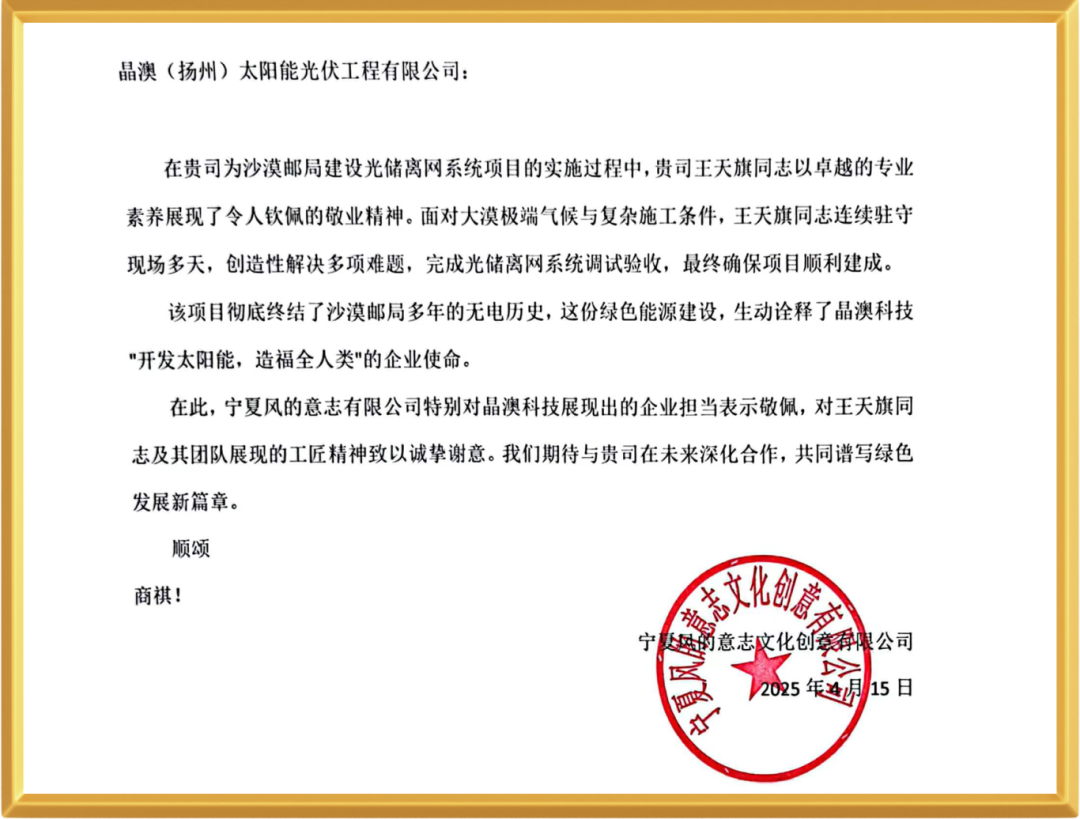 项目施工期间,面对频繁的沙尘侵袭以及极端干燥的气候环境,晶澳智慧能源项目经理带领团队驻守现场多日,24小时响应调试需求,保障了施工进度和质量,他的敬业精神和专业能力赢得了客户的高度认可。这份赞誉不仅是对我司EPC业务能力的肯定,更是对晶澳智慧能源“客户至上”服务理念的认可。
