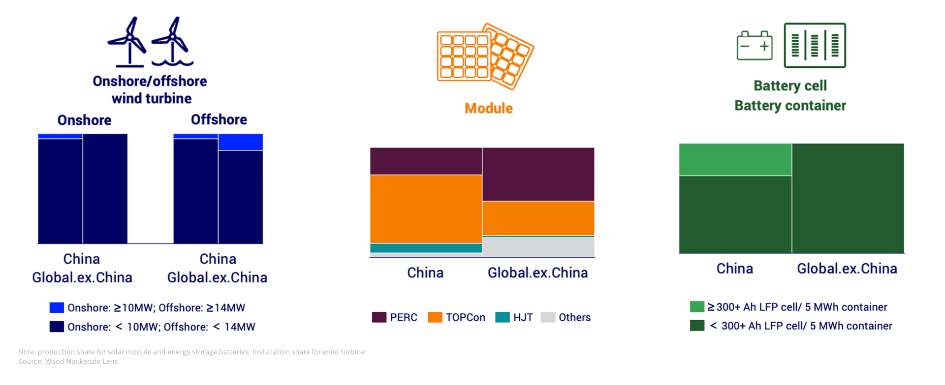 Share of technologies for solar modules, wind turbines and energy storage batteries, 2024