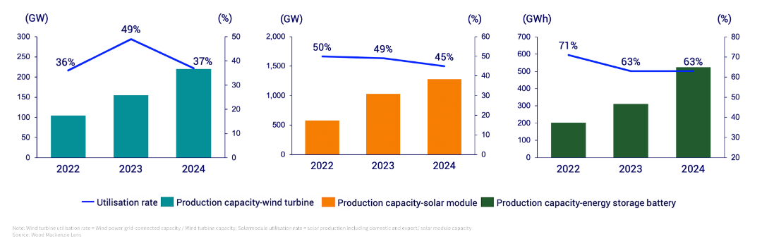2024年,中国在全球风电、光伏和储能产能中的占比分别达到69%、93%和89%,供应链主导地位进一步加强,为全球市场提供动力。然而,除储能电池外,风电和光伏供应链产能利用率连续三年低于50%,对供应链企业的财务表现产生负面影响。此外,中国可再生能源供应链的主导地位也引发了西方国家对于能源安全的依赖担忧,国际贸易摩擦加剧。