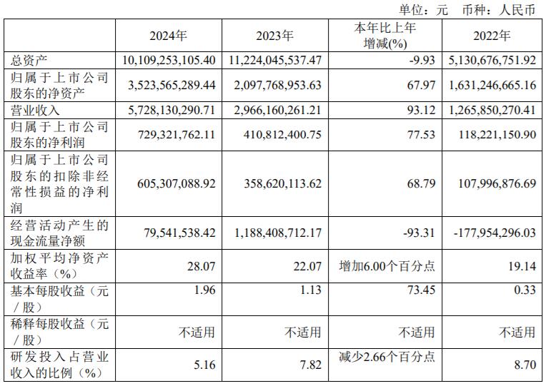 据年报披露,拉普拉斯2024年全年实现营业收入57.28亿元,同比增长93.12%;归属于上市公司股东的净利润达到7.29亿元,同比增长77.53%。这一成绩的取得,主要得益于光伏设备业务的强劲增长。作为公司的核心收入来源,光伏设备在2024年实现营收54.34亿元,营收占比高达94.87%,毛利率稳定在28.14%,较上年同期微增0.04个百分点。