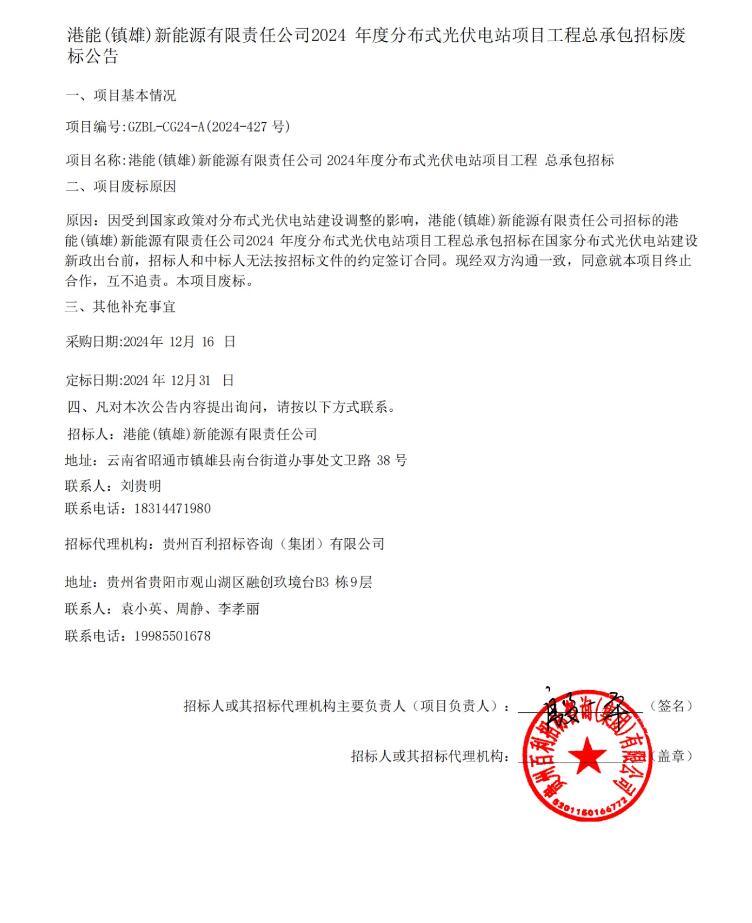 根据公告,因受到国家政策对分布式光伏电站建设调整的影响,港能(镇雄)招标的2024年度分布式光伏电站项目工程总承包招标在国家分布式光伏电站建设新政出台前,招标人和中标人无法按招标文件的约定签订合同。现经双方沟通一致,同意就本项目终止合作,互不追责。本项目废标。