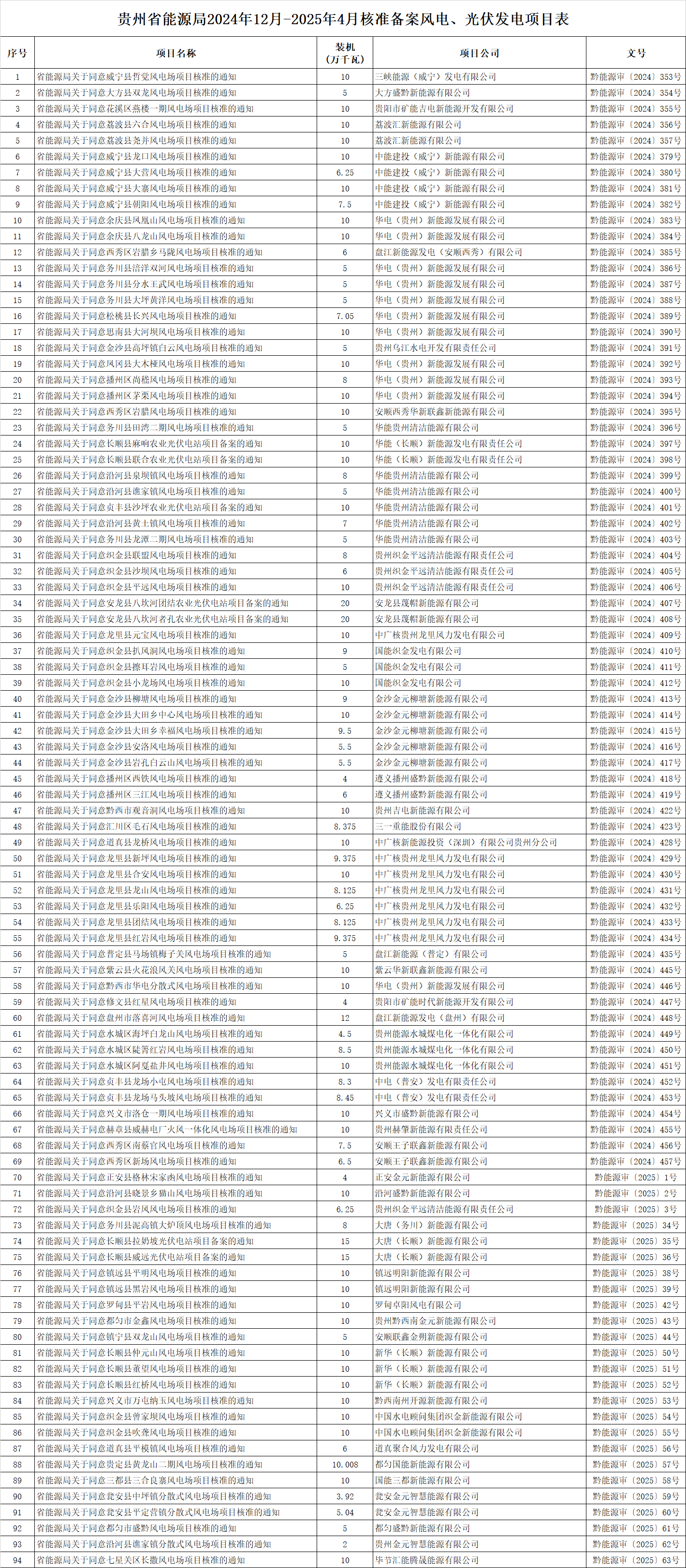 根据《省人民政府关于印发贵州省企业投资项目核准和备案管理办法的通知》(黔府发〔2018〕第7号),按照程序,贵州省能源局2024年12月-2025年4月核准备案风电、光伏发电项目94个,现将有关情况公布如下。