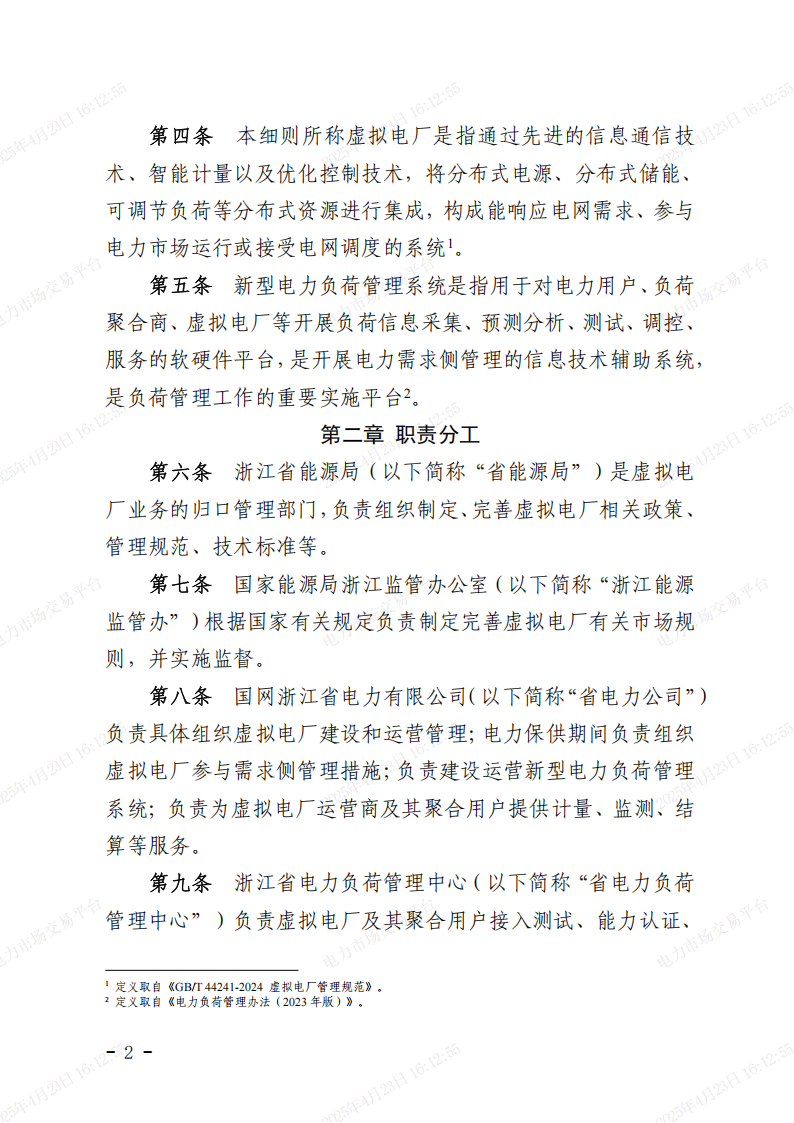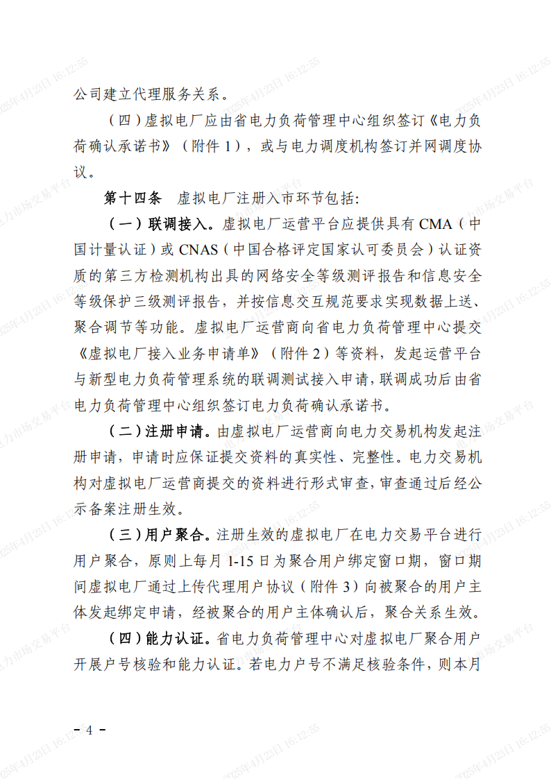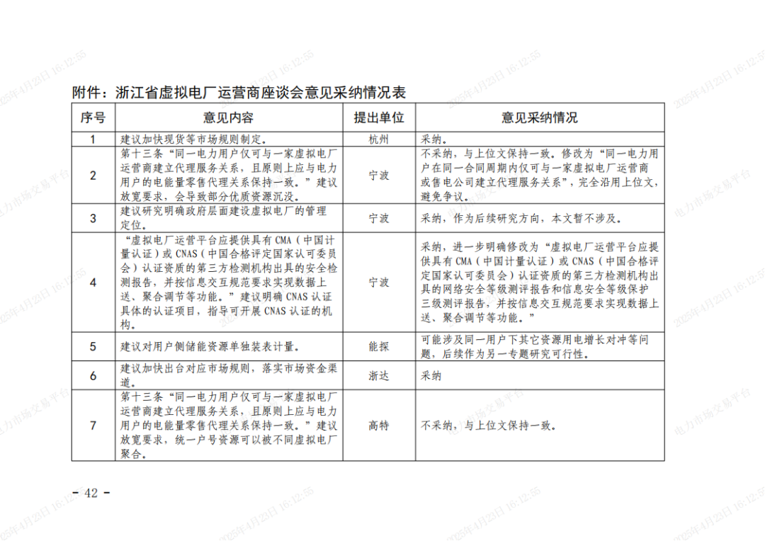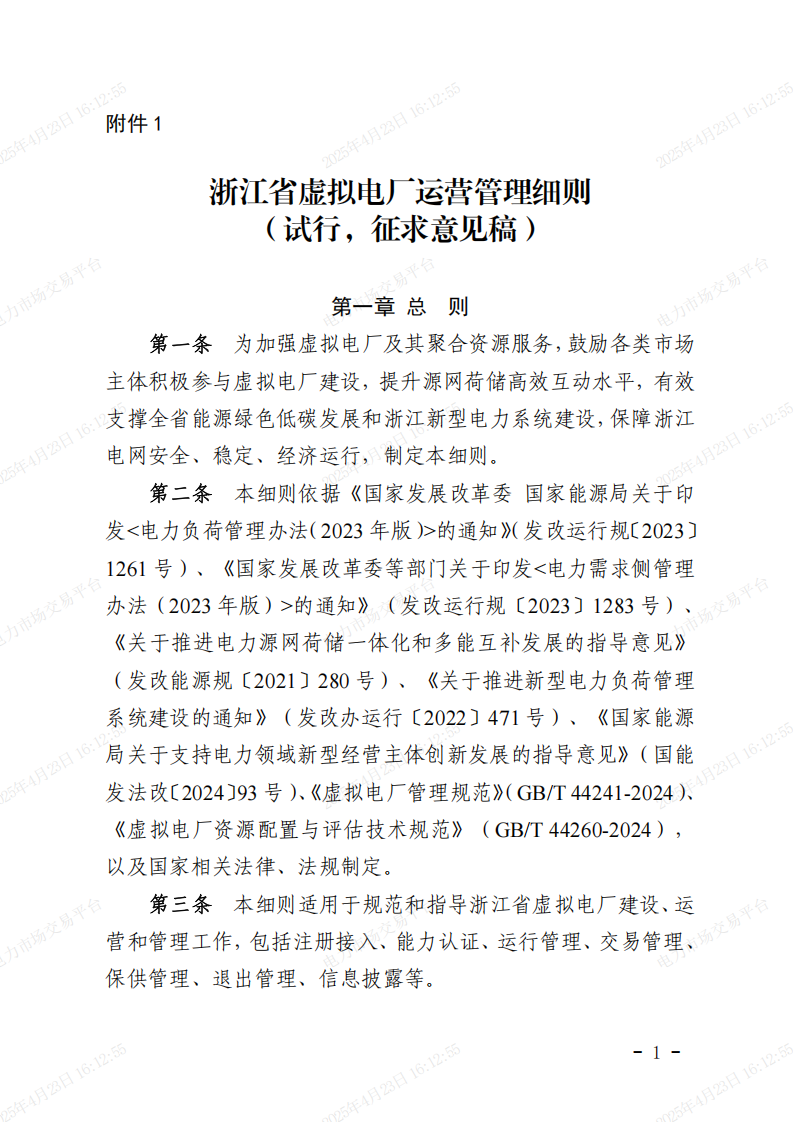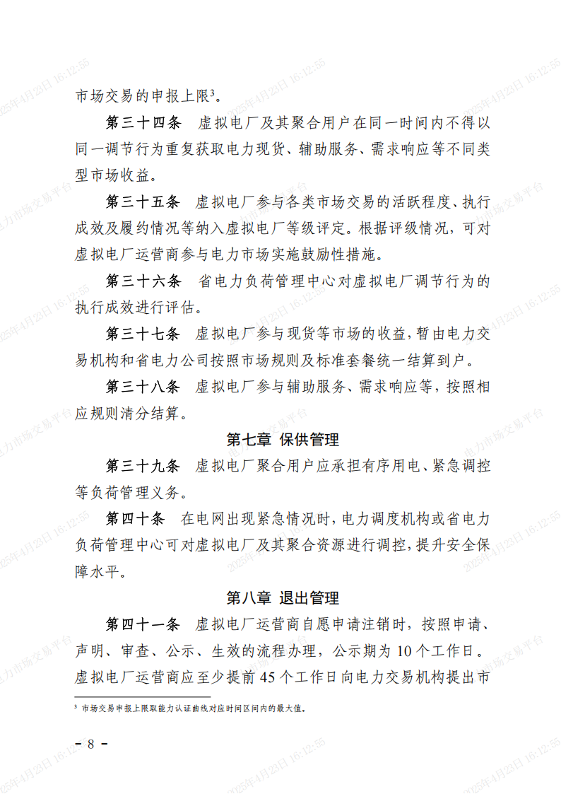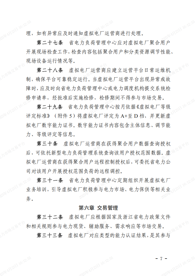 11月26日,浙江电力市场管理委员会发布《浙江电力中长期交易实施细则》等7份细则,适用于2026年电力市场交易、结算及市场管理等。《浙江电力现货电能量交易实施细则》提到,日前电能量交易组织方式采取“发电侧报量报价、用户侧报量不报价”的模式组织日前电能量市场交易。需求侧管理期间虚拟电厂不参与现货市场交易。加总后的全体申报负荷曲线,扣减虚拟电厂调节量申报曲线后,纳入日前市场出清。
