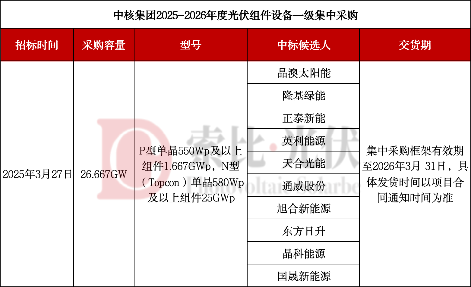 4月25日,中核集团2025-2026年度光伏组件设备一级集中采购项目中标候选人公示。根据此前发布的招标公告,本次采购容量共计26.667GW。其中,P型单晶550Wp及以上组件1.667GWp,N型(Topcon)单晶580Wp及以上组件25GWp。