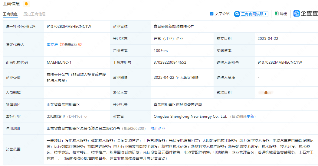 近日,青岛盛隆新能源有限公司成立,法定代表人为虞立涛,注册资本100万元。