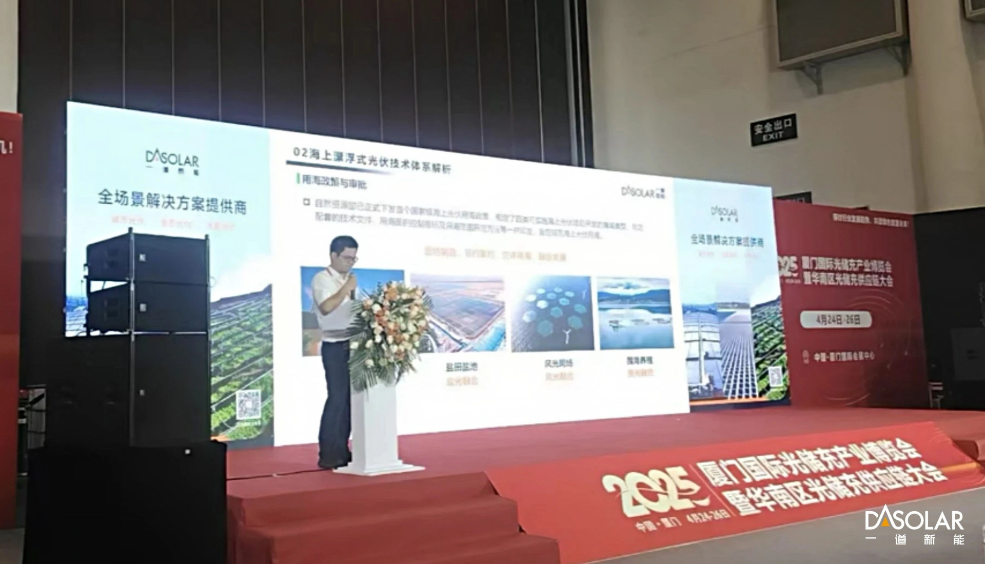 4月24日-25日,由厦门市新材料产业协会、中国能源网等联合主办的第十届华南区光储充供应链大会在厦门国际会展中心召开。本届大会聚焦“光储充”全产业链发展,围绕“绿色、低碳、发展”的创新主题,集中展示最新技术成果和融合创新路径。一道新能应用技术部产品总监潘浙锋先生受邀参会并发表题为《光伏在海洋牧场中的应用》的主题演讲,系统解读“光伏+海洋牧场”融合发展的前沿趋势与实践路径。