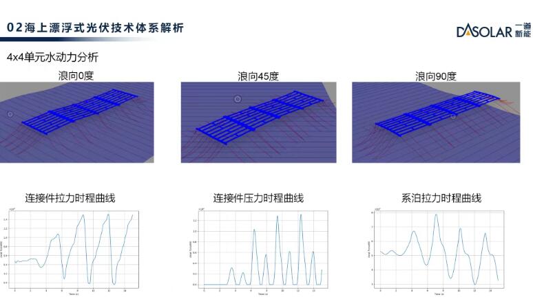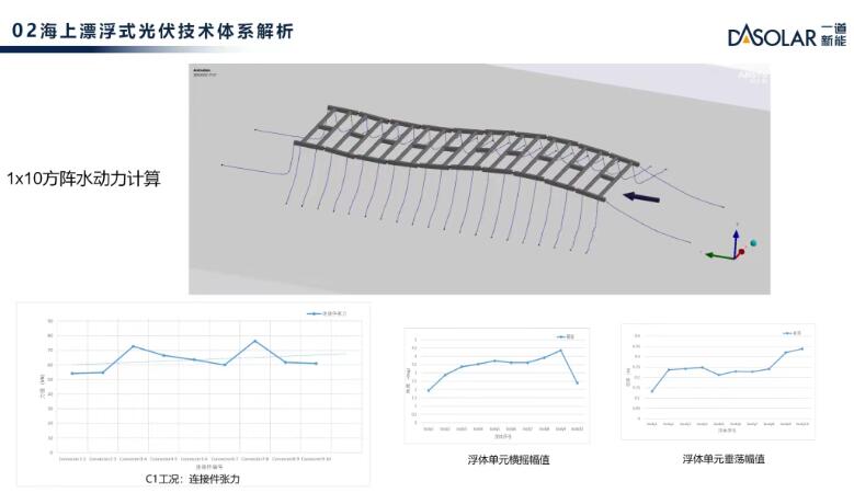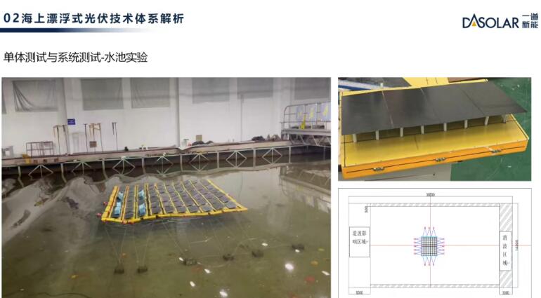 在仿真与测试方面,一道新能采用1×10方阵与4×4单元多浪向水动力模拟,对浮体单元的横摇、垂荡、张力和拉力等进行了系统全面评估,确保系统在面对水流冲击、风浪作用以及外部荷载时,能够保持良好的结构完整性,不易发生变形或损坏。此外,公司还围绕方管支架、楔形连接口、组件承重等关键环节,完成了全链条的抗弯强度测试,为设备的长期运行安全性提供了坚实保障。