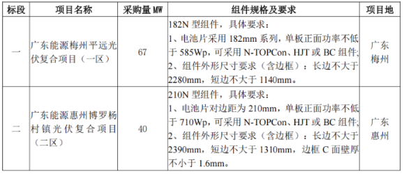 招标公告显示,项目为广东省电力开发有限公司2025年第一批光伏组件集中采购,包括广东省电力开发有限公司及其子公司投资建设的两个光伏项目,分两个标段,标段一暂定67MW,标段二暂定40MW。