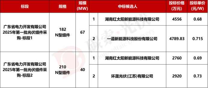 3家企业入围,分别是湖南红太阳新能源科技有限公司、一道新能源科技股份有限公司、环晟光伏(江苏)有限公司,投标单价0.68-0.73元/W。