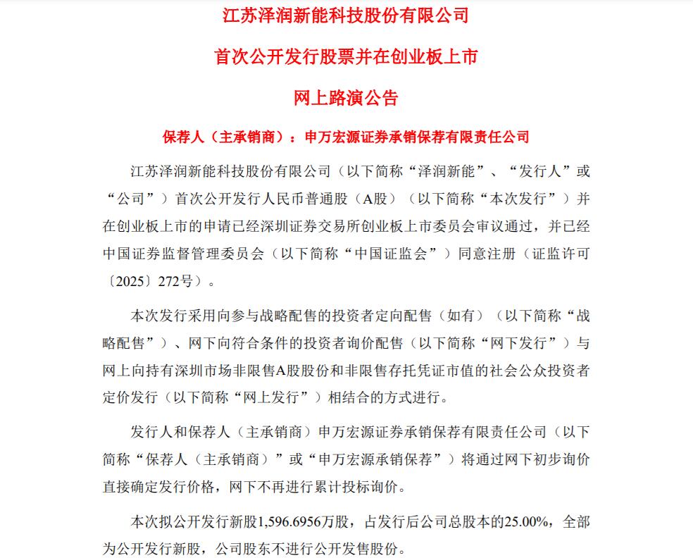 泽润新能本次拟公开发行股票1,596.6956万股,全部为新股发行。发行完成后,公司总股本将增至6,386.7823万股。在发行结构方面,初始战略配售发行数量为79.8347万股,占本次发行总量的5.00%。回拨机制启动前,网下初始发行数量为1,061.8109万股,占扣除初始战略配售数量后发行数量的70.00%;网上初始发行数量为455.0500万股,占比30.00%。公司本次发行的初步询价时间为4月22日9:30 - 15:00,4月25日则安排了网上路演活动,以便投资者更全面地了解公司情况。