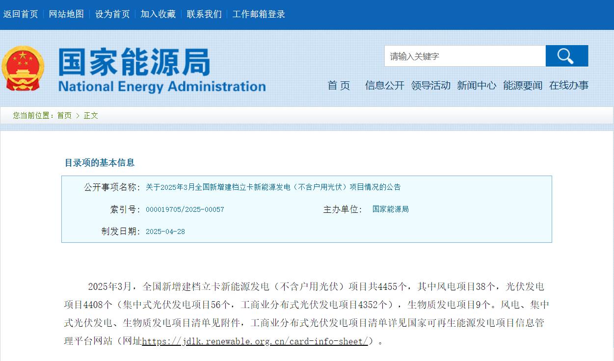 4月28日,国家能源局发布关于2025年3月全国新增建档立卡新能源发电(不含户用光伏)项目情况的公告。公告指出2025年3月,全国新增建档立卡新能源发电(不含户用光伏)项目共4455个,其中风电项目38个,光伏发电项目4408个(集中式光伏发电项目56个,工商业分布式光伏发电项目4352个),生物质发电项目9个。