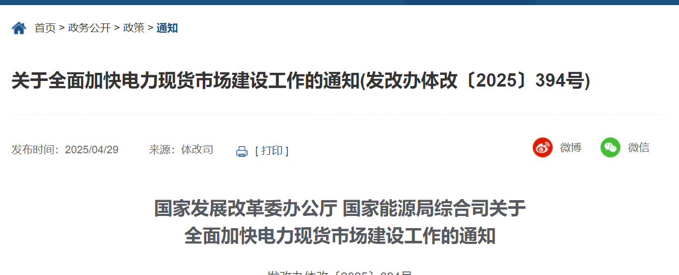 发改办体改〔2025〕394号各省、自治区、直辖市、新疆生产建设兵团发展改革委、能源局,天津市工业和信息化局、内蒙古自治区工业和信息化厅、辽宁省工业和信息化厅、广西壮族自治区工业和信息化厅、重庆市经济和信息化委员会、四川省经济和信息化厅、甘肃省工业和信息化厅,北京市城市管理委员会,国家能源局各派出机构,中国核工业集团有限公司、国家电网有限公司、中国南方电网有限责任公司、中国华能集团有限公司、中国大唐集团有限公司、中国华电集团有限公司、国家电力投资集团有限公司、中国长江三峡集团有限公司、国家能源投资集团有限责任公司、国家开发投资集团有限公司、华润(集团)有限公司、中国广核集团有限责任公司、内蒙古电力(集团)有限责任公司,北京电力交易中心、广州电力交易中心、中国电力企业联合会:为贯彻落实党的二十大和二十届二中、三中全会精神,围绕构建全国统一大市场要求建设全国统一电力市场,全面加快电力现货市场建设,2025年底前基本实现电力现货市场全覆盖,全面开展连续结算运行,充分发挥现货市场发现价格、调节供需的关键作用,现就有关工作通知如下: