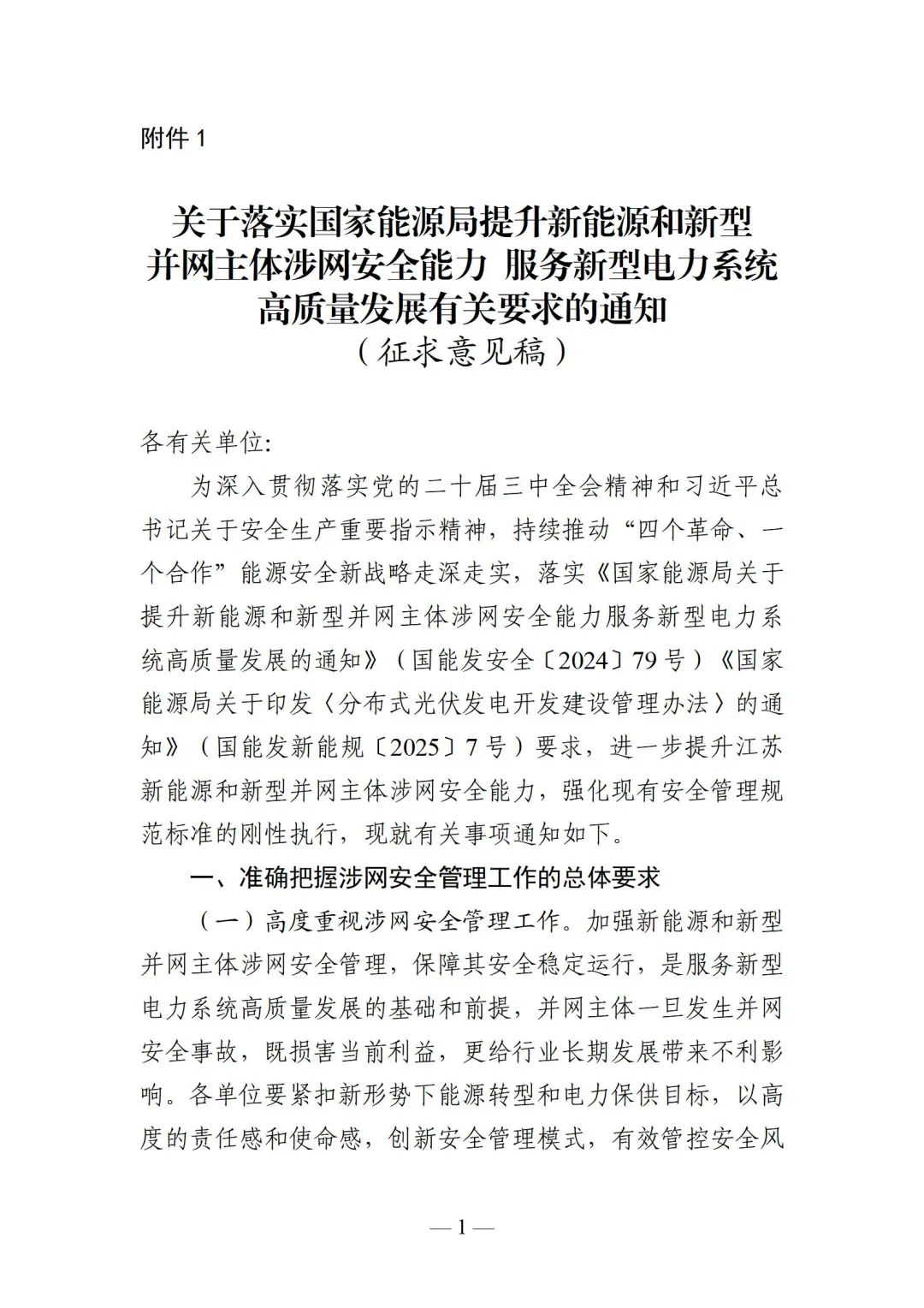 为贯彻落实《国家能源局关于提升新能源和新型并网主体涉网安全能力 服务新型电力系统高质量发展的通知》(国能发安全〔2024〕79号)和相关宣贯会议要求,我办起草了《关于落实国家能源局提升新能源和新型并网主体涉网安全能力 服务新型电力系统高质量发展有关要求的通知(征求意见稿)》,现向社会公开征求意见。