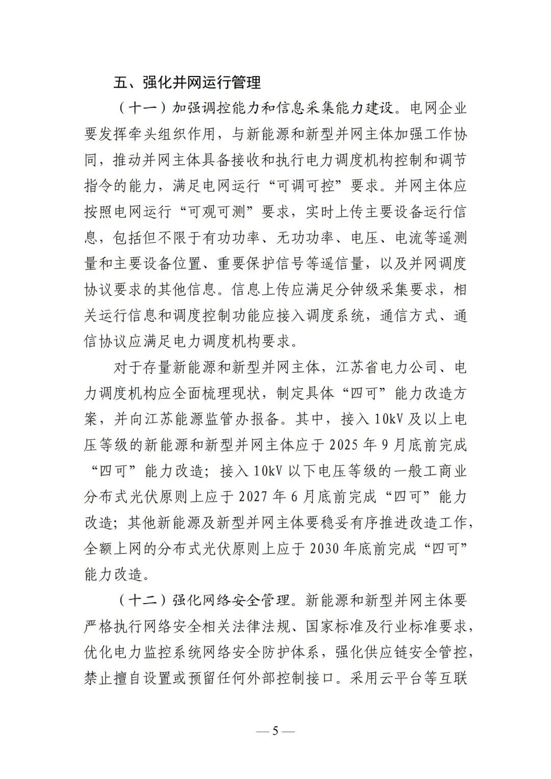4月30日,江苏能源监管办关于公开征求《关于落实国家能源局提升新能源和新型并网主体涉网安全能力 服务新型电力系统高质量发展有关要求的通知(征求意见稿)》意见的公告,公告指出,对于存量新能源和新型并网主体,江苏省电力公司、电力调度机构应全面梳理现状,制定具体“四可”能力改造方案,并向江苏能源监管办报备。其中,接入10kV及以上电压等级的新能源和新型并网主体应于2025年9月底前完成“四可”能力改造;接入10kV以下电压等级的一般工商业分布式光伏原则上应于2027年6月底前完成“四可”能力改造;其他新能源及新型并网主体要稳妥有序推进改造工作,全额上网的分布式光伏原则上应于2030年底前完成“四可”能力改造。