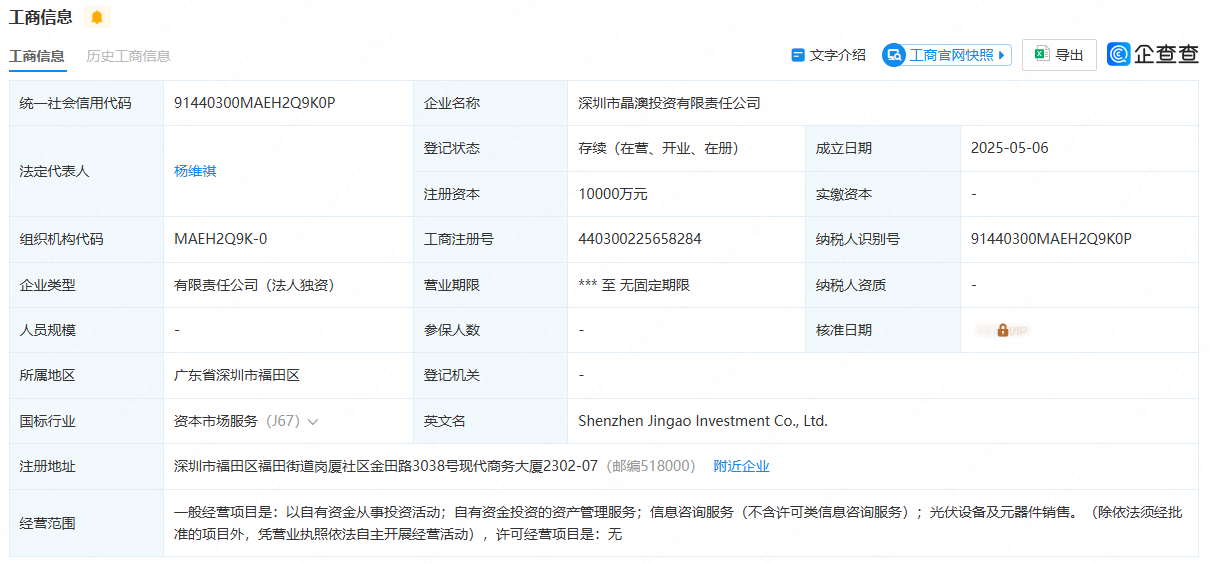 企查查APP显示,近日,深圳市晶澳投资有限责任公司成立,法定代表人为杨维祺,注册资本1亿元,经营范围包含:以自有资金从事投资活动;自有资金投资的资产管理服务;信息咨询服务(不含许可类信息咨询服务);光伏设备及元器件销售。企查查股权穿透显示,该公司由晶澳科技(002459)全资持股。