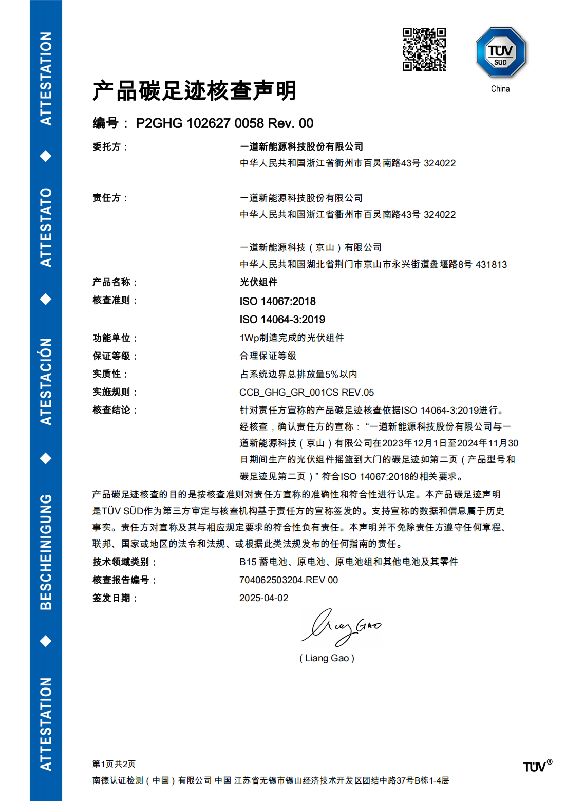 近日,一道新能衢州基地与京山基地荣获ISO 14067产品碳足迹认证证书,标志着当前公司已构建起覆盖产品全生命周期的碳管理体系,为光伏行业乃至制造业绿色转型提供了可复制、可推广的“中国方案”。