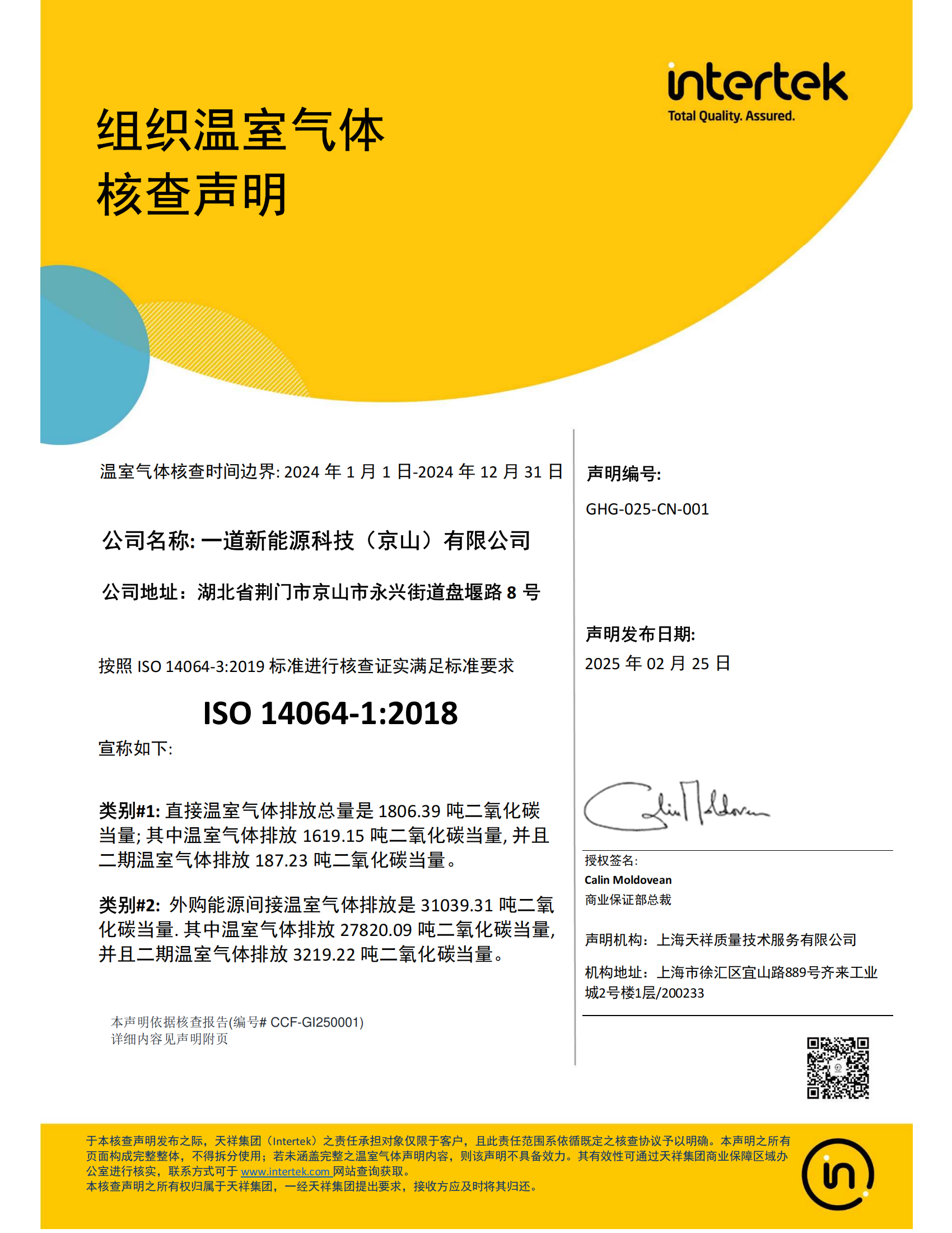 在生产基地建设方面,一道新能积极贯彻“用地集约化、原料无害化、生产洁净化、废物资源化、能源低碳化”等“五化”指导思想,形成全域并进、协同共进的低碳布局。当前,一道新能衢州、泰州、漳州、京山基地已陆续通过碳核查,获颁ISO 14064组织温室气体核查声明。衢州、漳州基地更是一马当先成为集团首批"零碳工厂",通过光伏屋顶发电等技术组合,实现100%清洁能源供给。