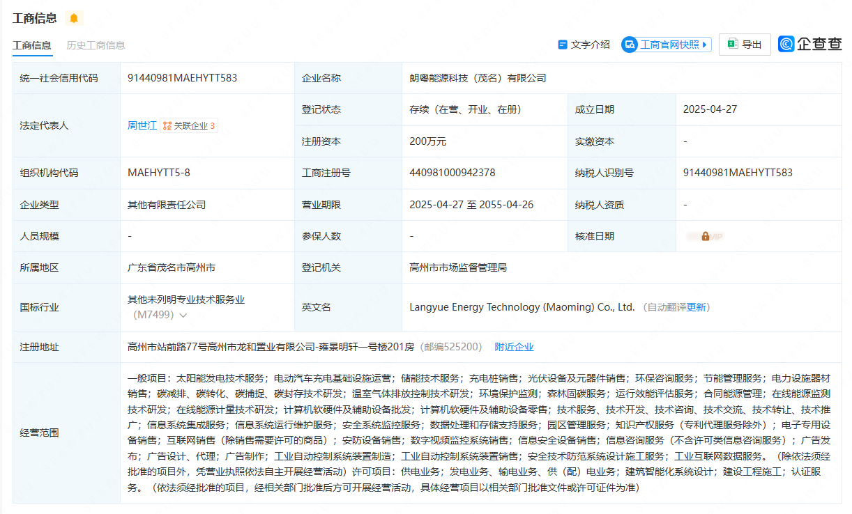 企查查APP显示,近日,朗粤能源科技(茂名)有限公司成立,法定代表人为周世江,注册资本为200万元,经营范围包含:太阳能发电技术服务;电动汽车充电基础设施运营;储能技术服务;充电桩销售;光伏设备及元器件销售;环保咨询服务等。企查查股权穿透显示,该公司由茂名市茂昱科技发展有限公司、朗新集团旗下朗新投资管理无锡有限公司持股。